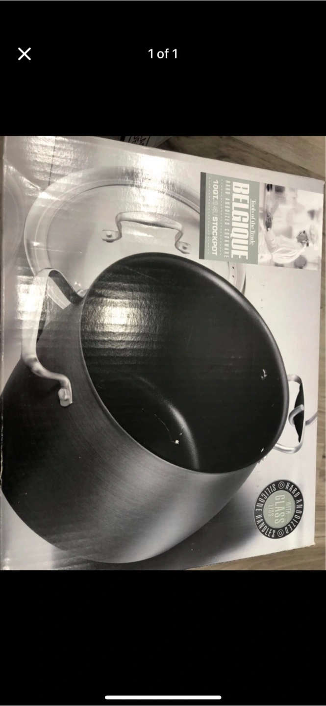 Selling a Belgique hard anodized cookware stockpot. It's a 100T (9.46L) stockpot. The pot has hard anodized silicone handles with a glass lid. Great for making soups or stews!