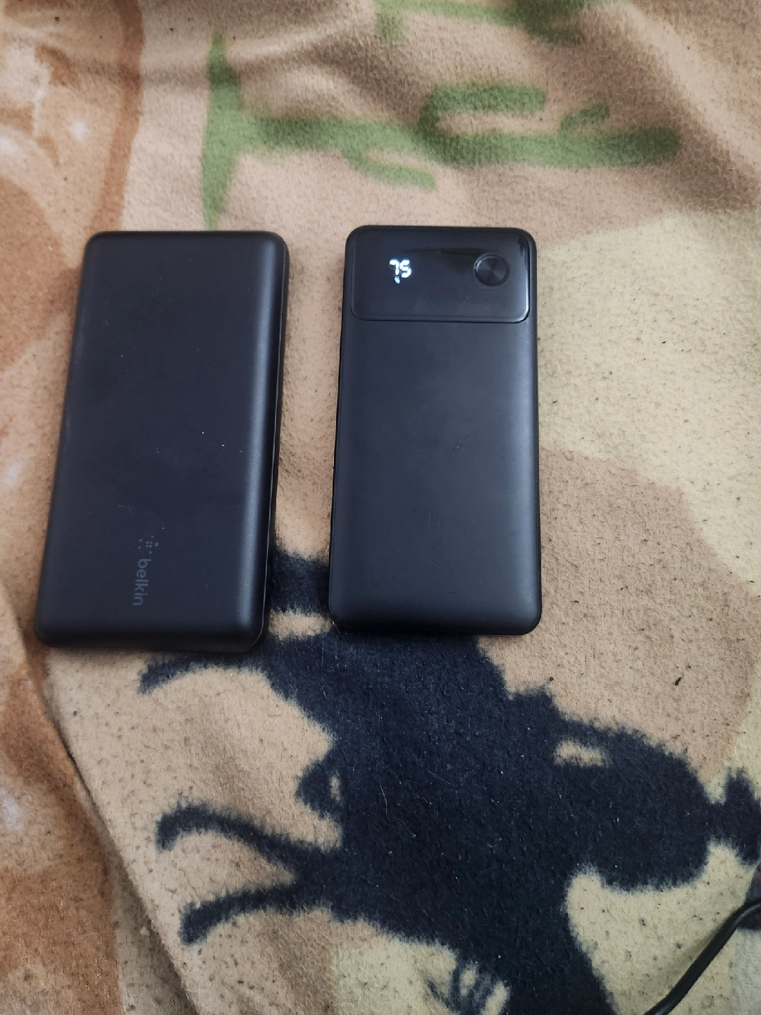 Selling two Belkin power banks in black. One has a digital display showing the battery percentage. Great for charging your devices on the go! the two power banks
