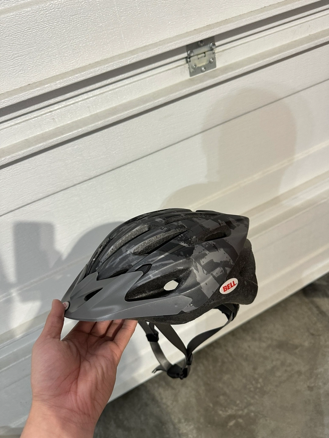 Selling a Bell bike helmet in a grey camouflage pattern. It's in great shape and ready for your next ride!
