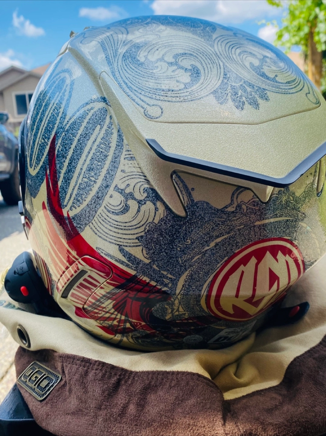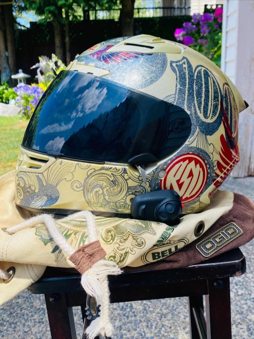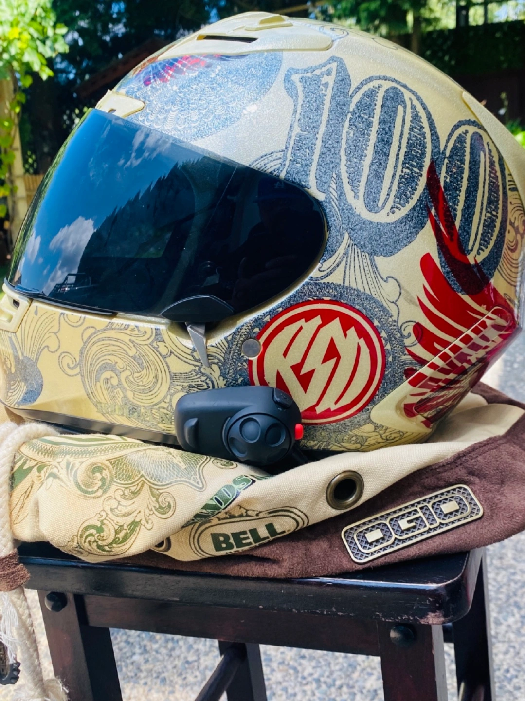 Selling a Bell motorcycle helmet. It has a unique design with red and blue accents on a beige background. The size isn't marked, so please check the fit before buying! Comes with a dark tinted visor and a Bell bag.