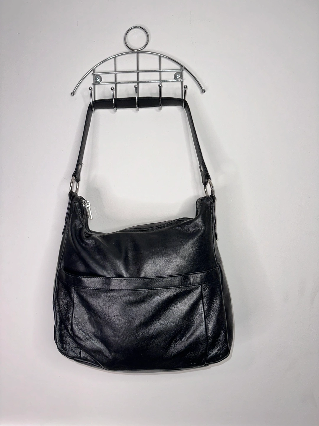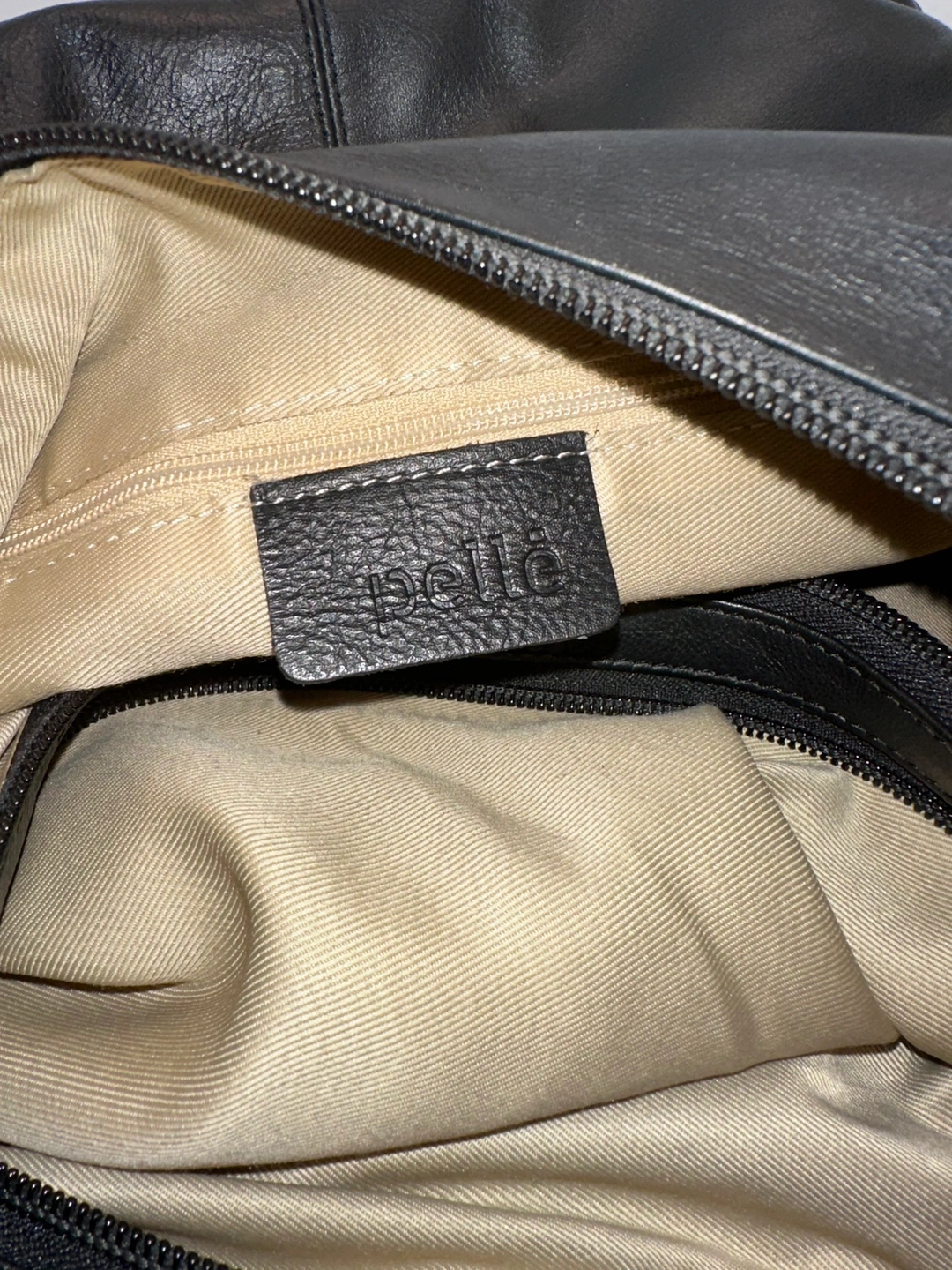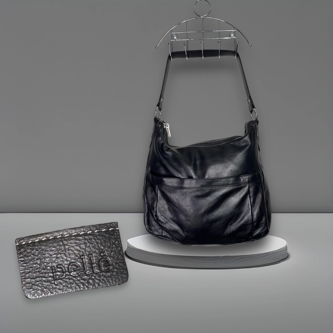 Elevate your style with this chic Pelle Pelle black leather shoulder bag. Crafted from high-quality materials, this bag features a sleek design with a single shoulder strap. Perfect for everyday use or special occasions, it offers ample space for your essentials while maintaining a sophisticated look. Features: Brand: Pelle Pelle Material: Polyurethane Foam (Body), Paper Board (Packaging) Color: Black Strap: Single shoulder strap Condition: very good, gently used Why You’ll Love It: Timeless design that complements any outfit Durable and high-quality materials Perfect for both casual and formal occasions Don’t miss out on this stylish and versatile accessory. Add a touch of elegance to your wardrobe with this Pelle Pelle shoulder bag!