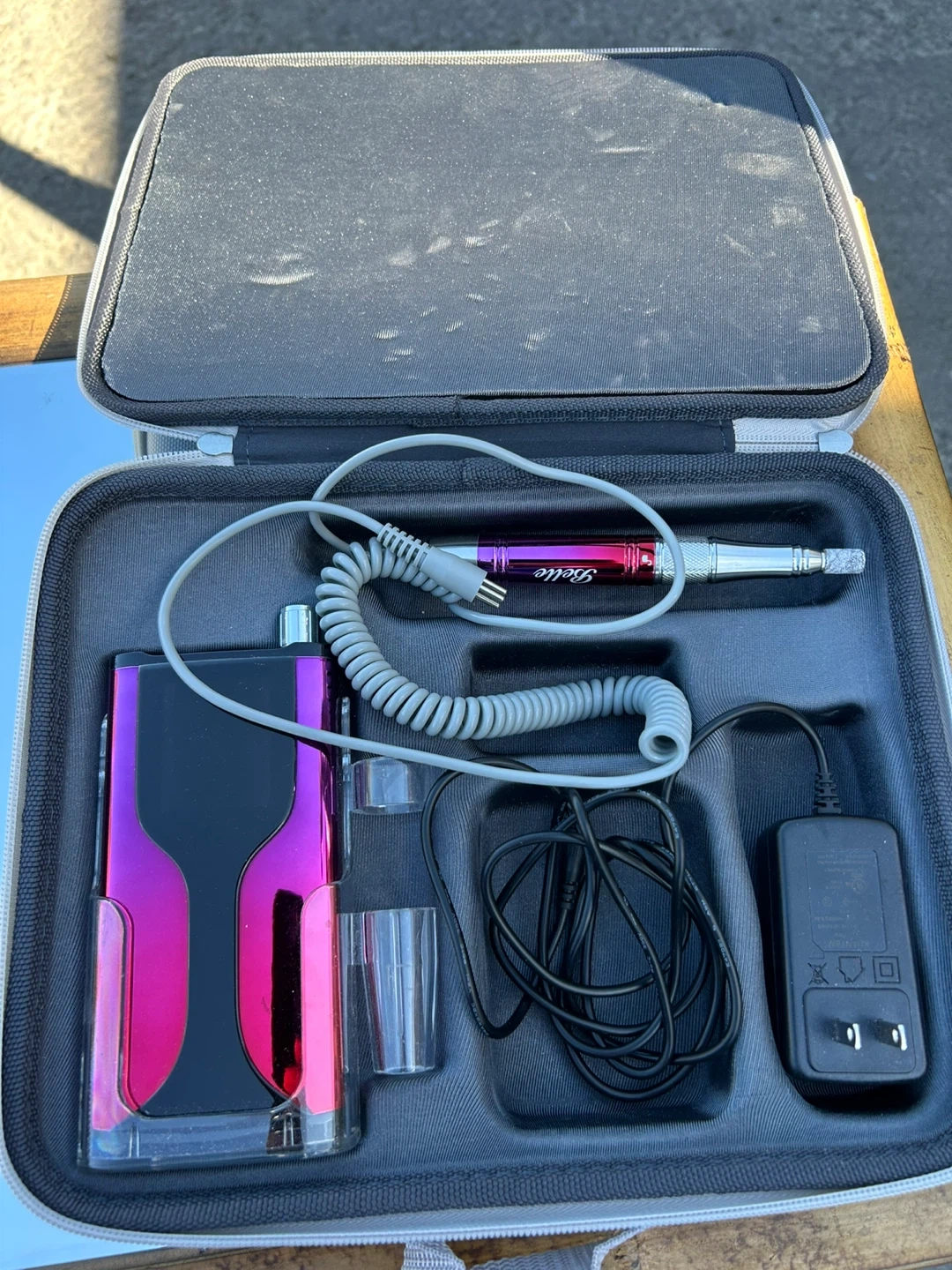 Selling a Belle nail drill machine. It comes with its case and all the components you see in the picture, including the drill, power adapter, and some drill bits. Great for at-home manicures!