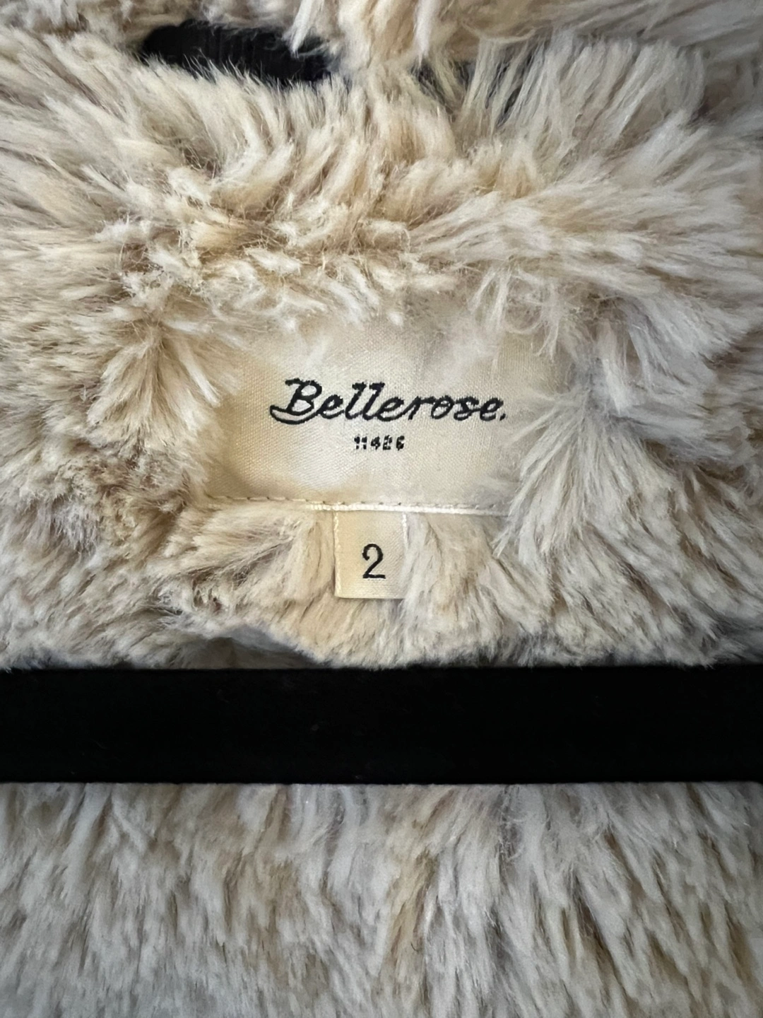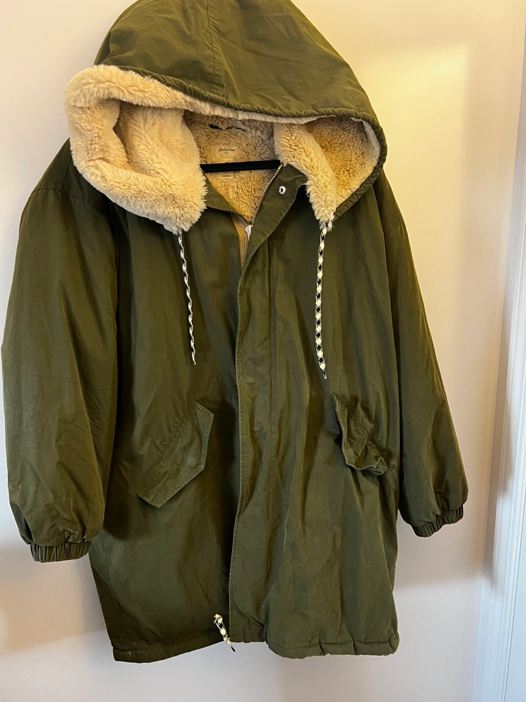 Olive green parka, size 2 but fits oversized. Features a sherpa-lined hood and drawstring closure. Long sleeves with elasticized cuffs. Pockets at the front. Excellent for colder weather. Original price $550