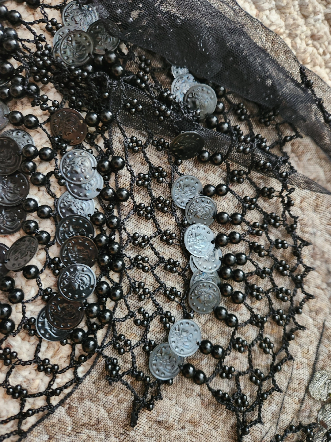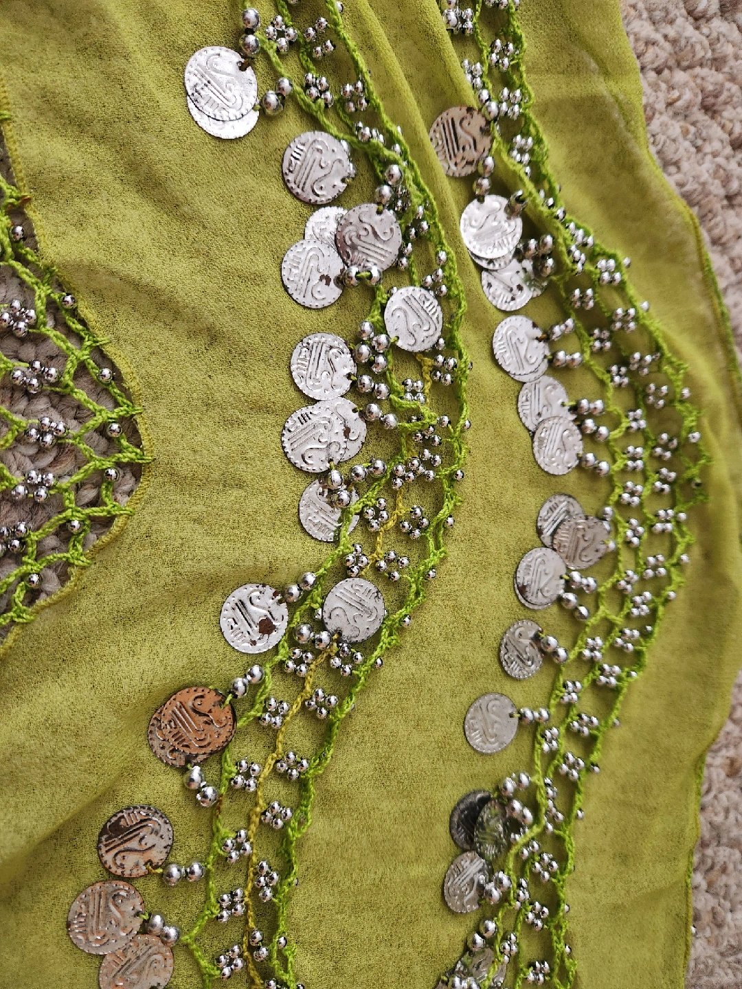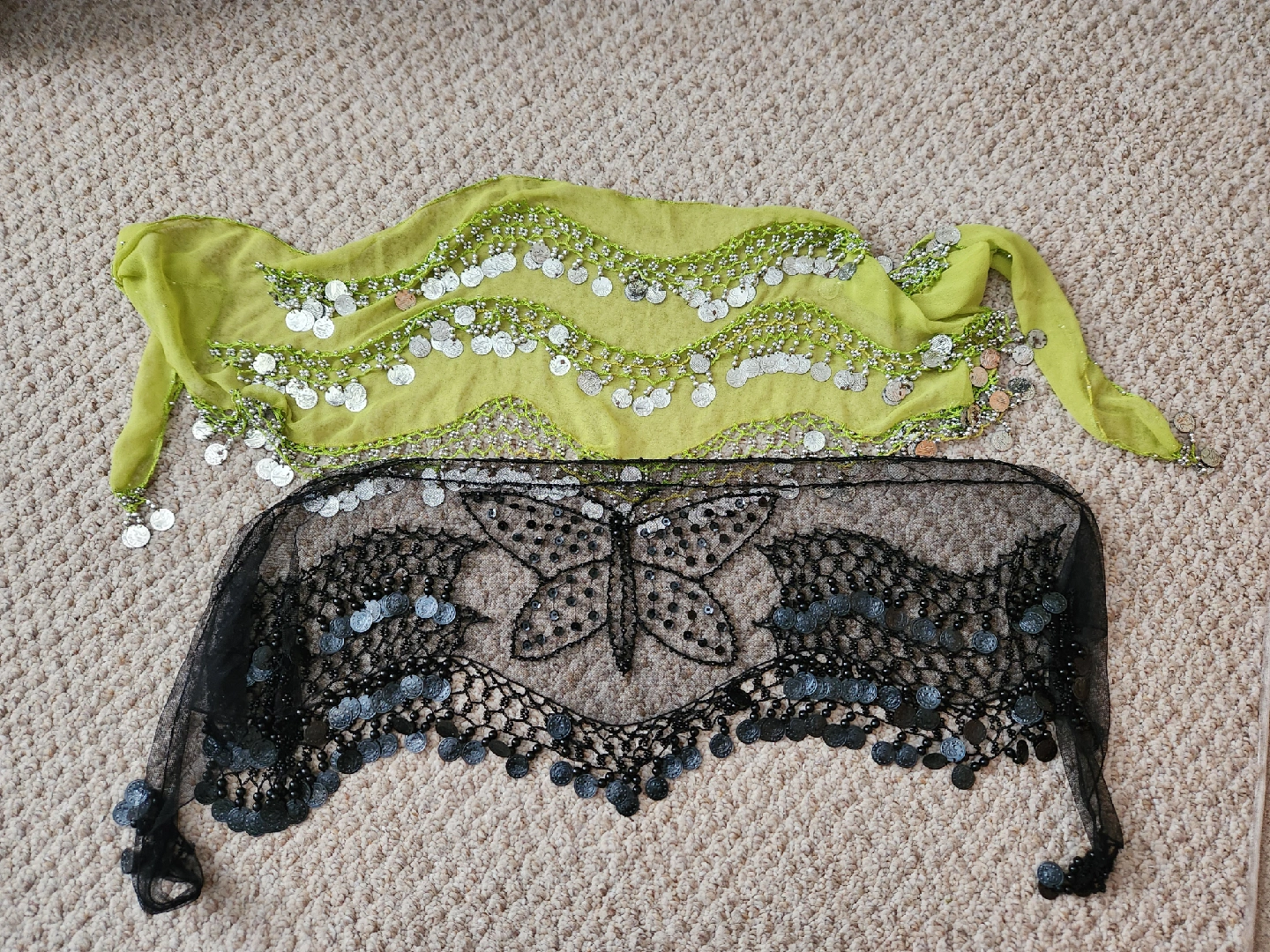 Two belly dance hip scarves for sale! One is black with a butterfly design and black beads and coins. The other is a light green colour with silver beads and coins. Both are in great condition and ready for a new dancer! or for Halloween costume! $15 each or both for $25