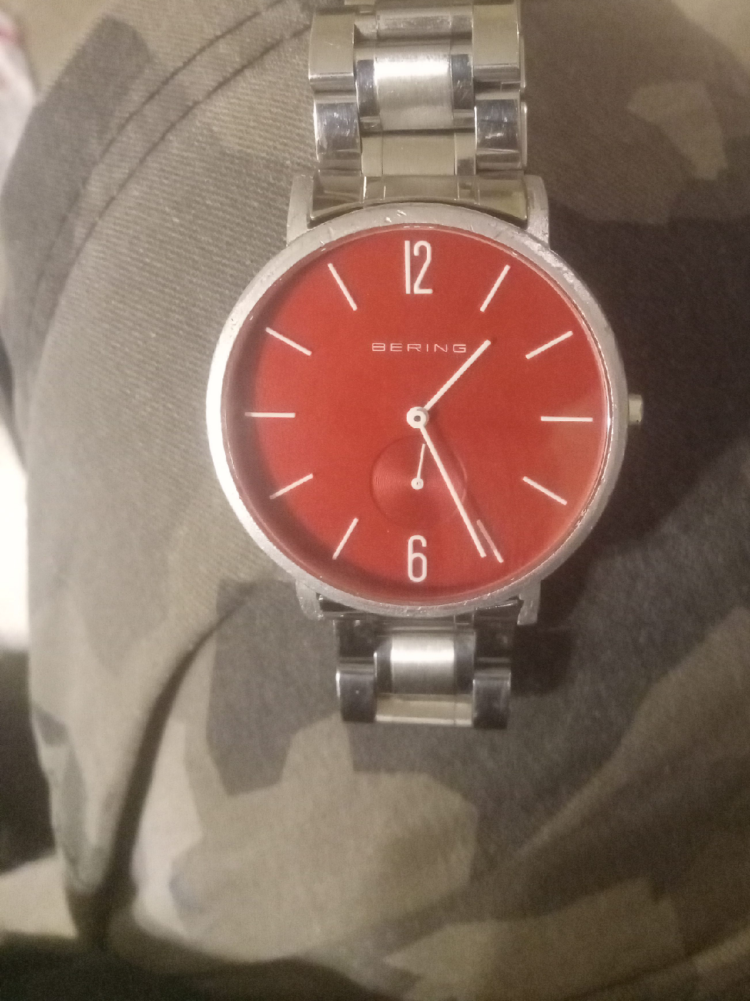 Selling a Bering watch with a striking red dial and stainless steel band. It's in great condition and ready for a new home!
