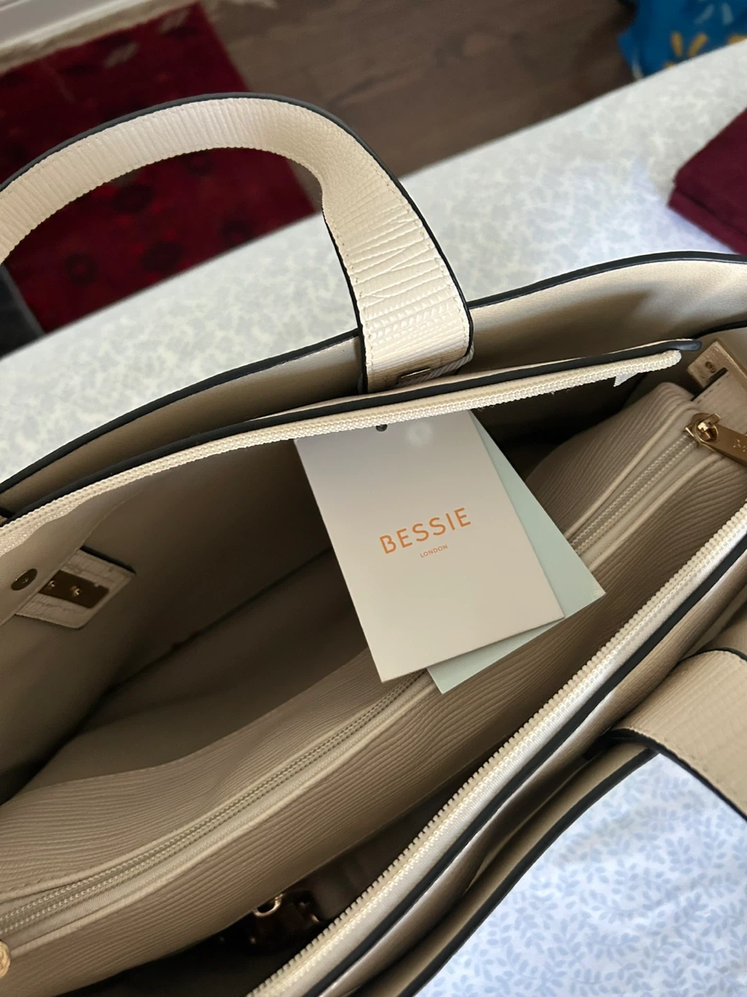 Looking to sell this Bessie London tote bag! It's a lovely cream colour and in great condition. It's perfect for everyday use or as a stylish work bag. The bag has a structured design with gold-tone hardware accents, adding a touch of elegance. Inside, there's plenty of room for your essentials, with a zippered compartment for secure storage