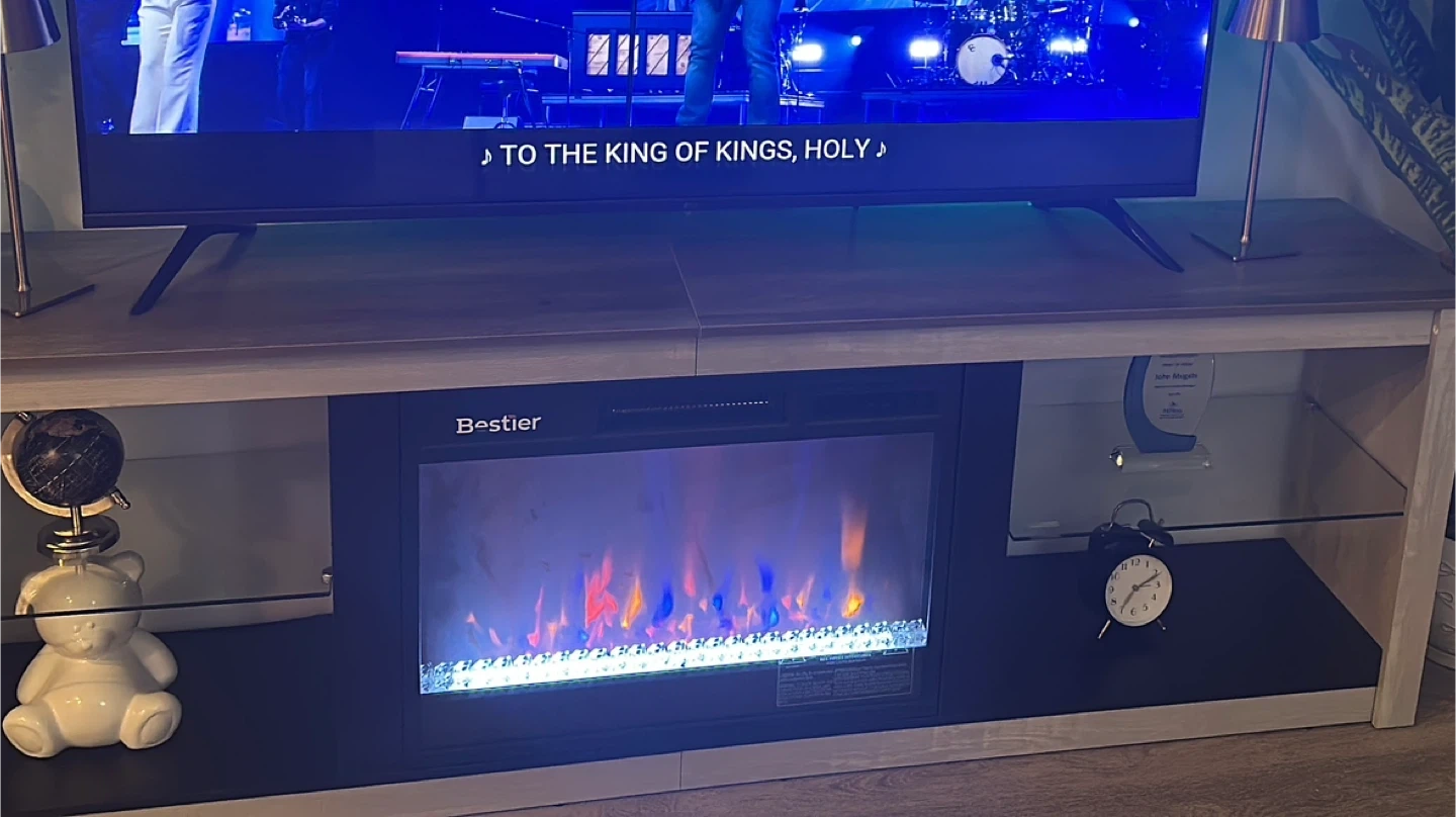 Selling a Bestier fireplace TV stand! It's in great condition and ready to find a new home. This stand features a built-in electric fireplace, perfect for adding warmth and ambiance to your living room. It also offers ample storage space for your media devices and accessories