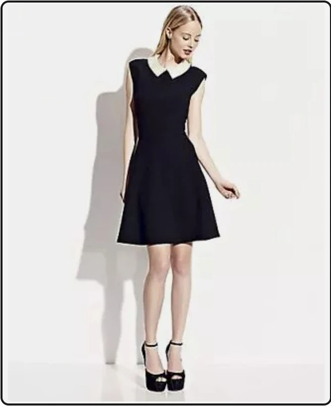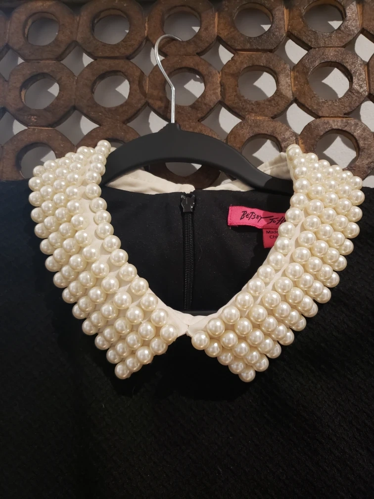 Sleeveless black dress with a large pearl collar. Classic and elegant. Purchased from Good Juicebox Vintage.