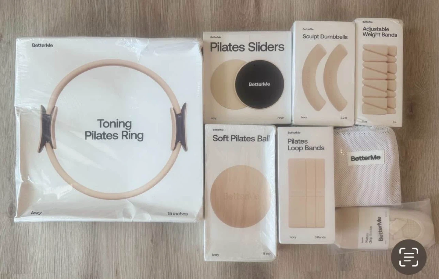 BetterMe Pilates set! Includes: - Toning Pilates Ring (15 inches) - Pilates Sliders (7 inch) - Adjustable Weight Bands - Soft Pilates Ball (6 inch) - Pilates Loop Bands - Grip Socks Opened but all UNUSED