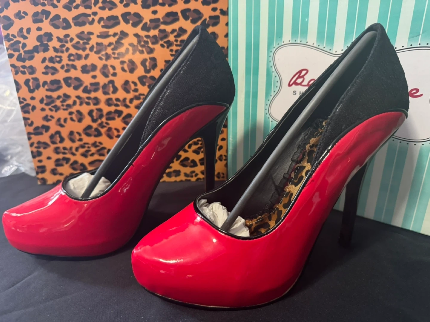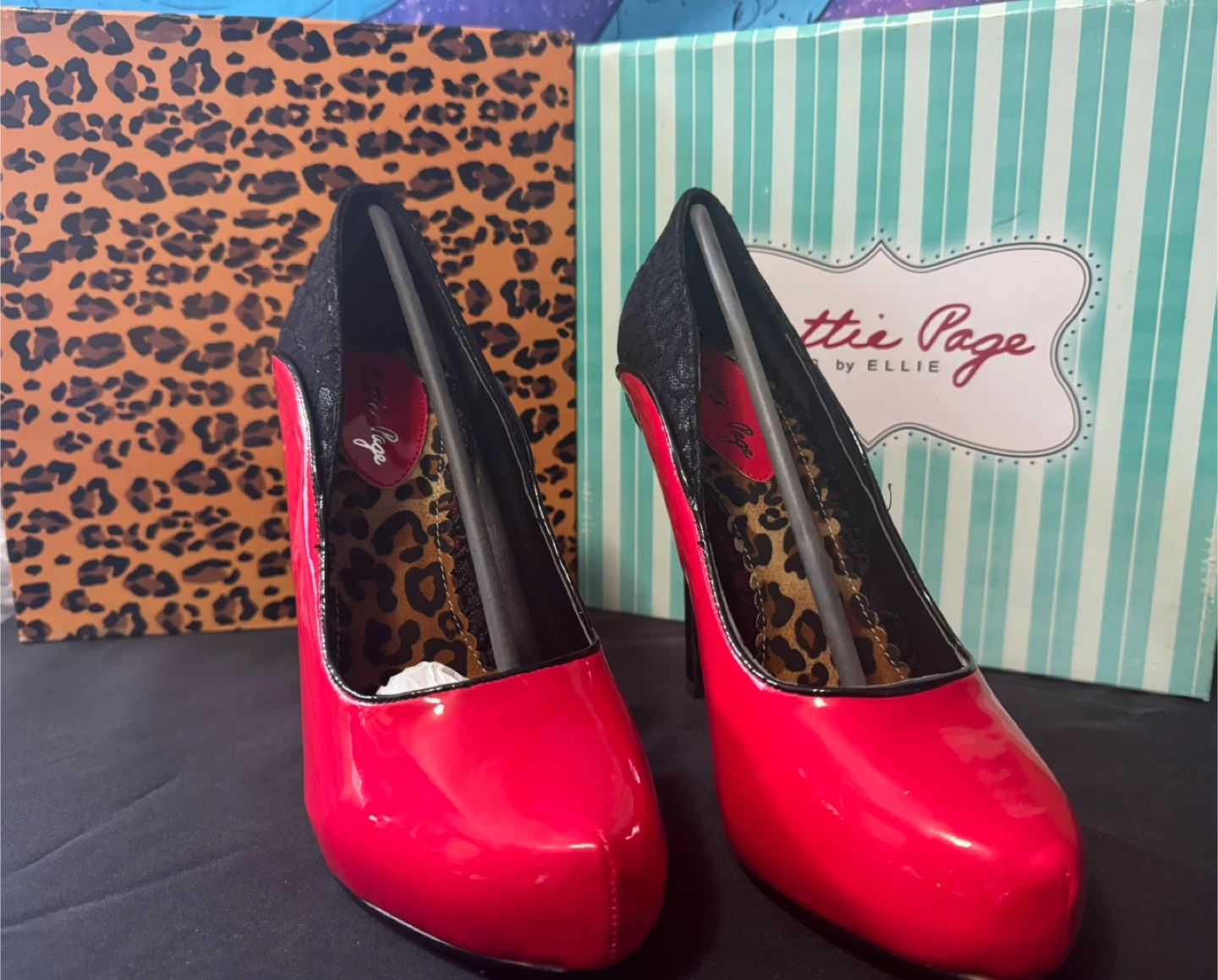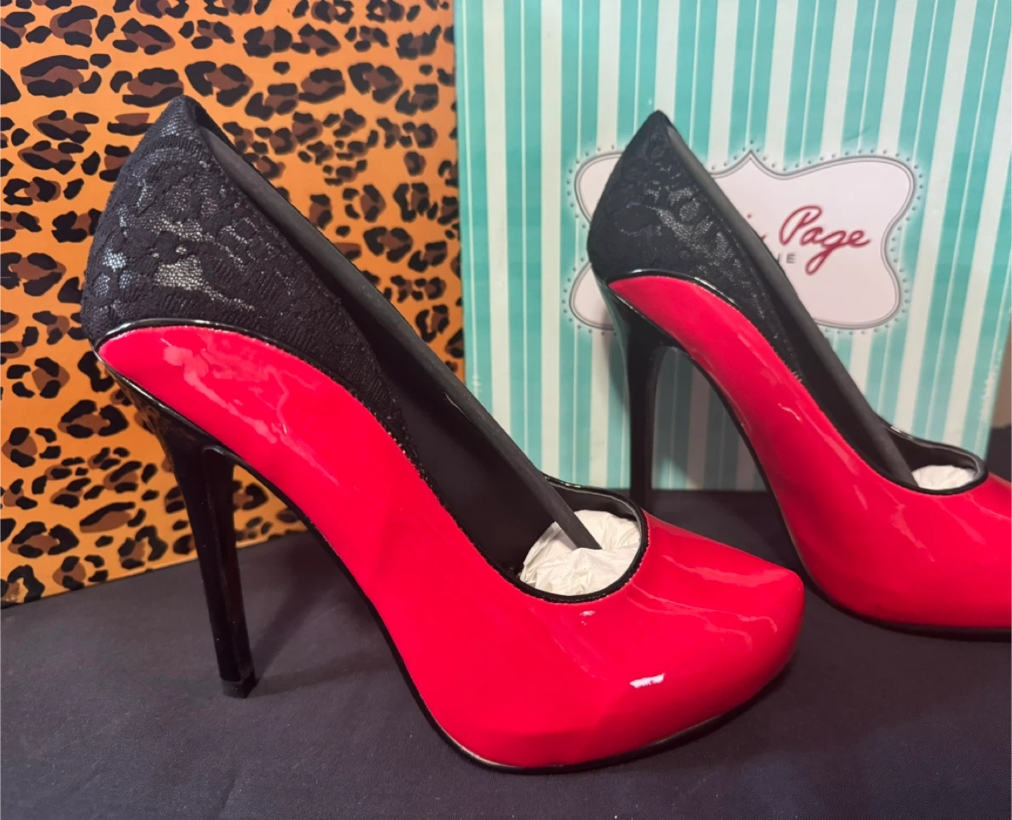 Featuring a striking red and black design, available in sizes 8, 9 and 10. These are brand new, never worn heels. Note that boxes come with each pair . If you see this ad the shoes are still available. * Brand: Bettie Page by Ellie * Colour: Red and Black * Style: Heels * Condition: New * Sizes Available: 2 pairs in size 10 2 pairs in size 9 2 pairs in size 8 Based on similar listings, these are priced to sell at C$35