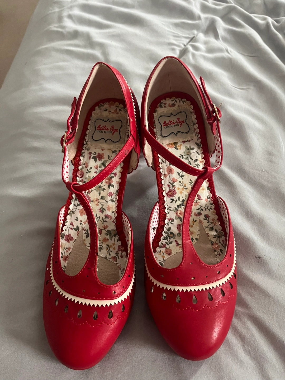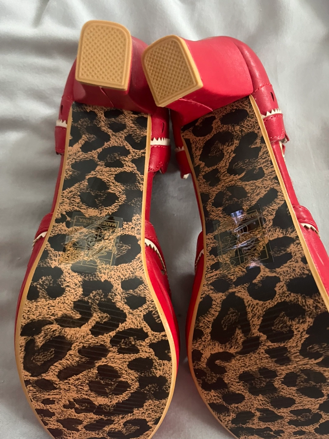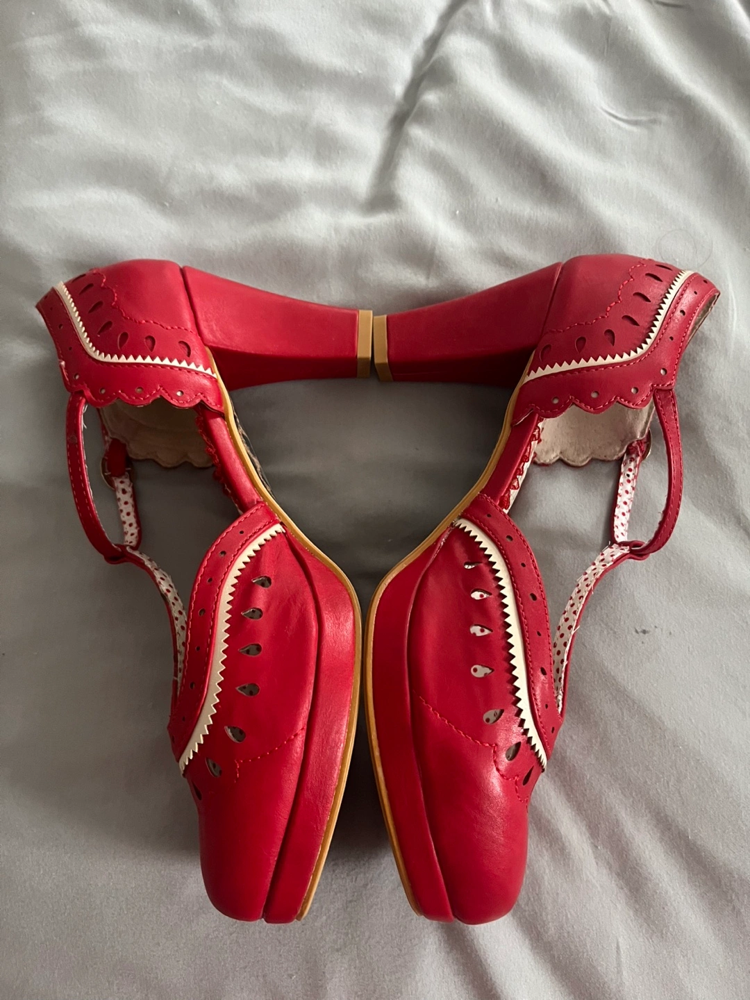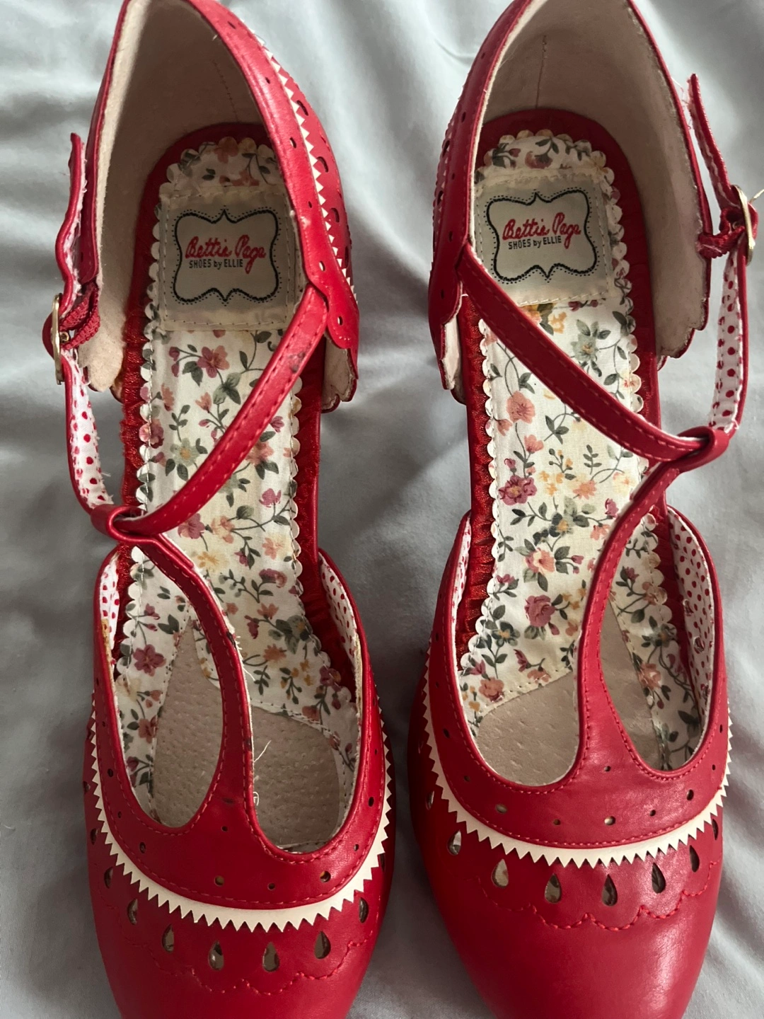 Betty Page retro Red T-strap heels. Block heel. Floral insole. White detailing. Leopard print soles. Size not shown.Never worn only tried on at home. 10 fits all types given style I’m a wide width.