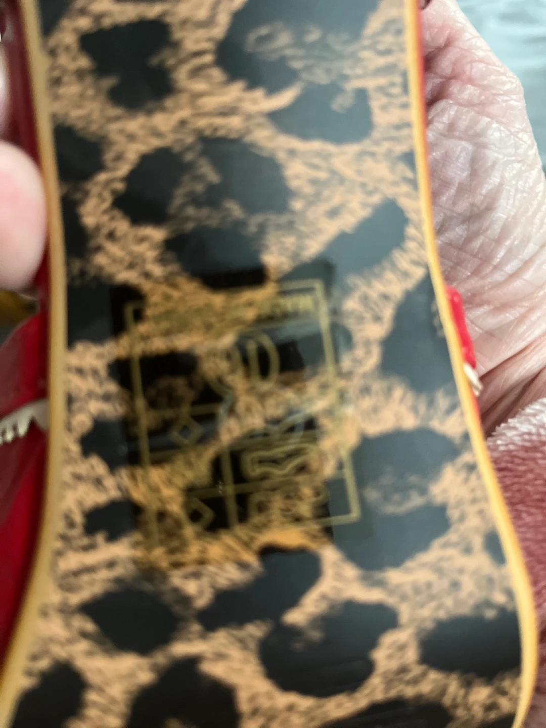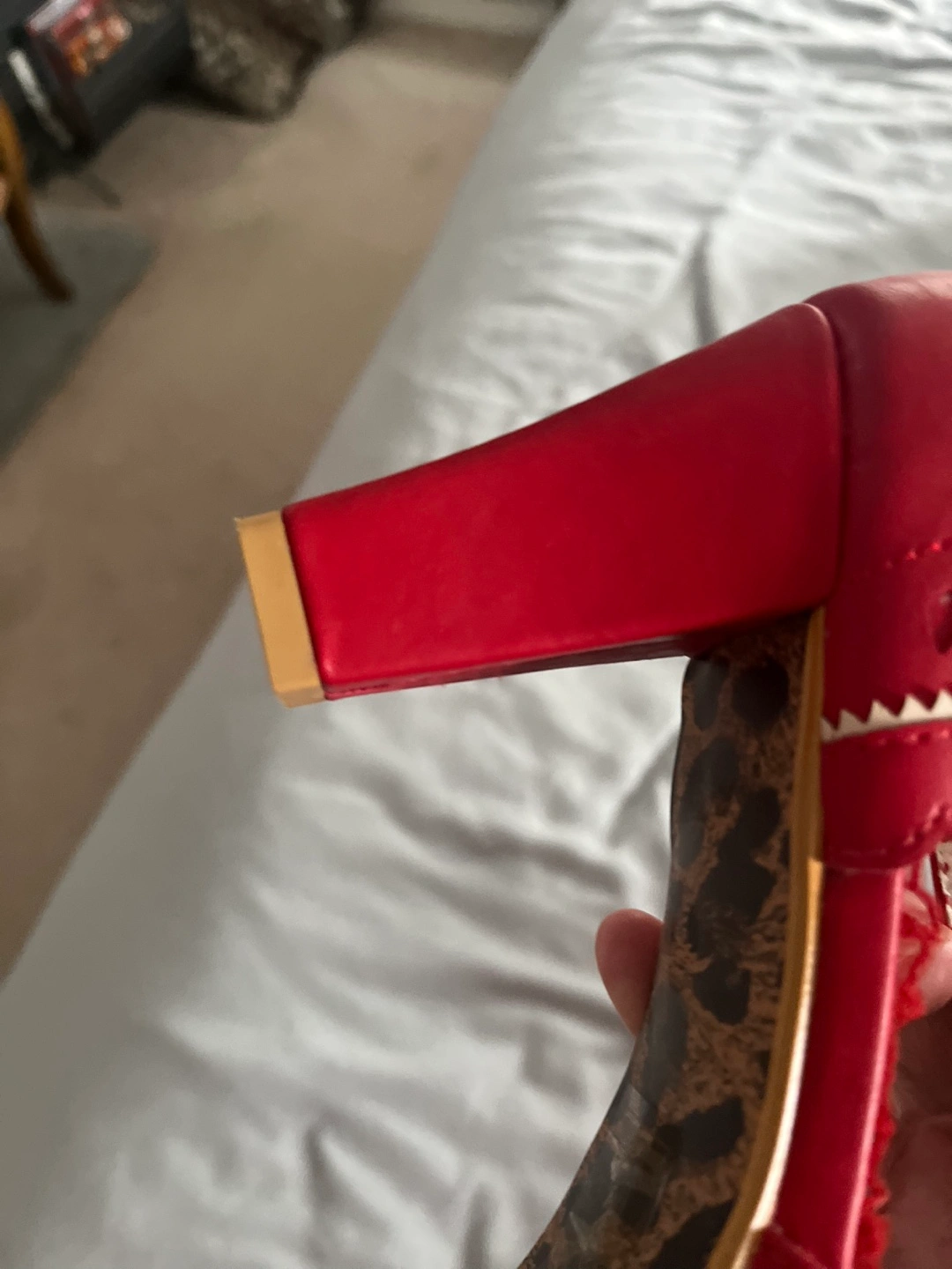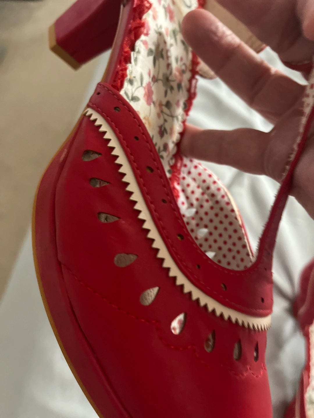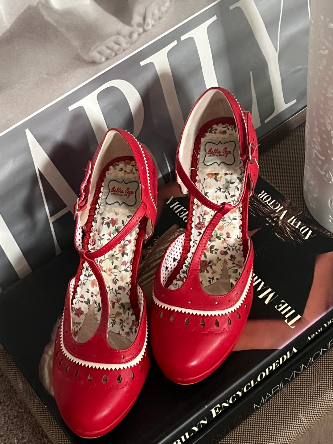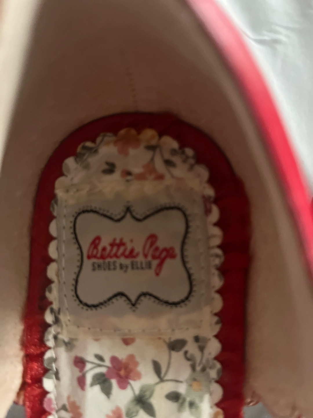Betty Page retro Red T-strap heels. Block heel. Floral insole. White detailing. Leopard print soles. Size not shown.Never worn only tried on at home. 10 fits all types given style I’m a wide width.
