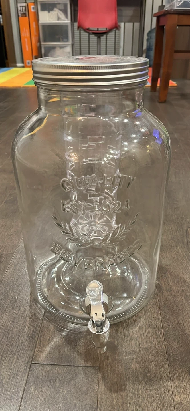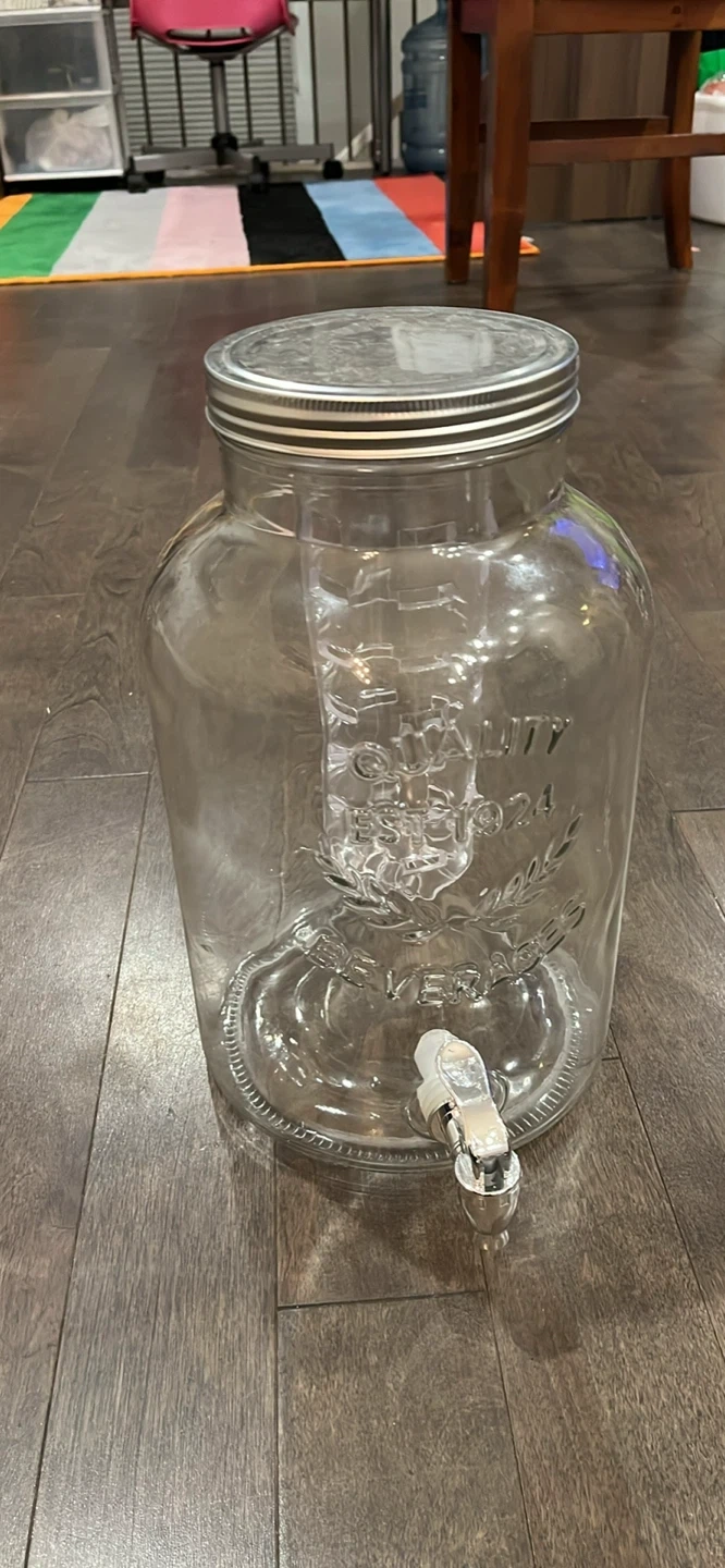 Selling a lovely beverage dispenser, perfect for parties or everyday use. It features a spigot for easy serving. The glass is clear, so you can easily see what's inside. It's in great condition and ready for a new home
