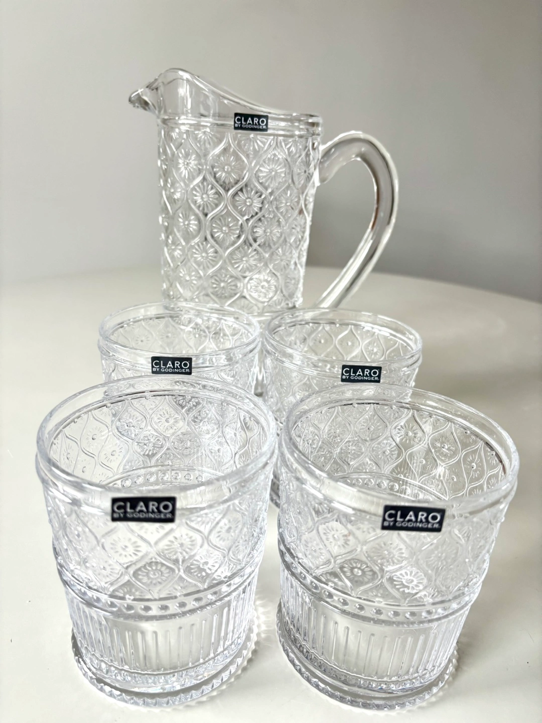 The Godinger Dublin 5-Piece Beverage Set originally is listed for $120 USD on Macy's department store. Godinger products are generally available at major retailers across the USA. I got it as a gift and I don’t actually use it. Brand new. Including : Beverage Pitcher - 33 oz 4 double old fashioned glass - 12 oz