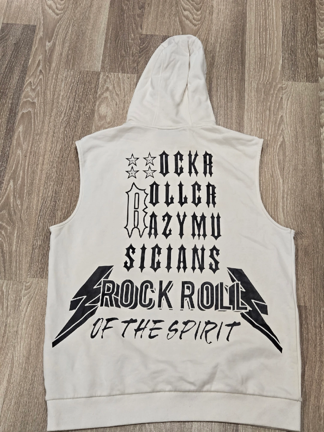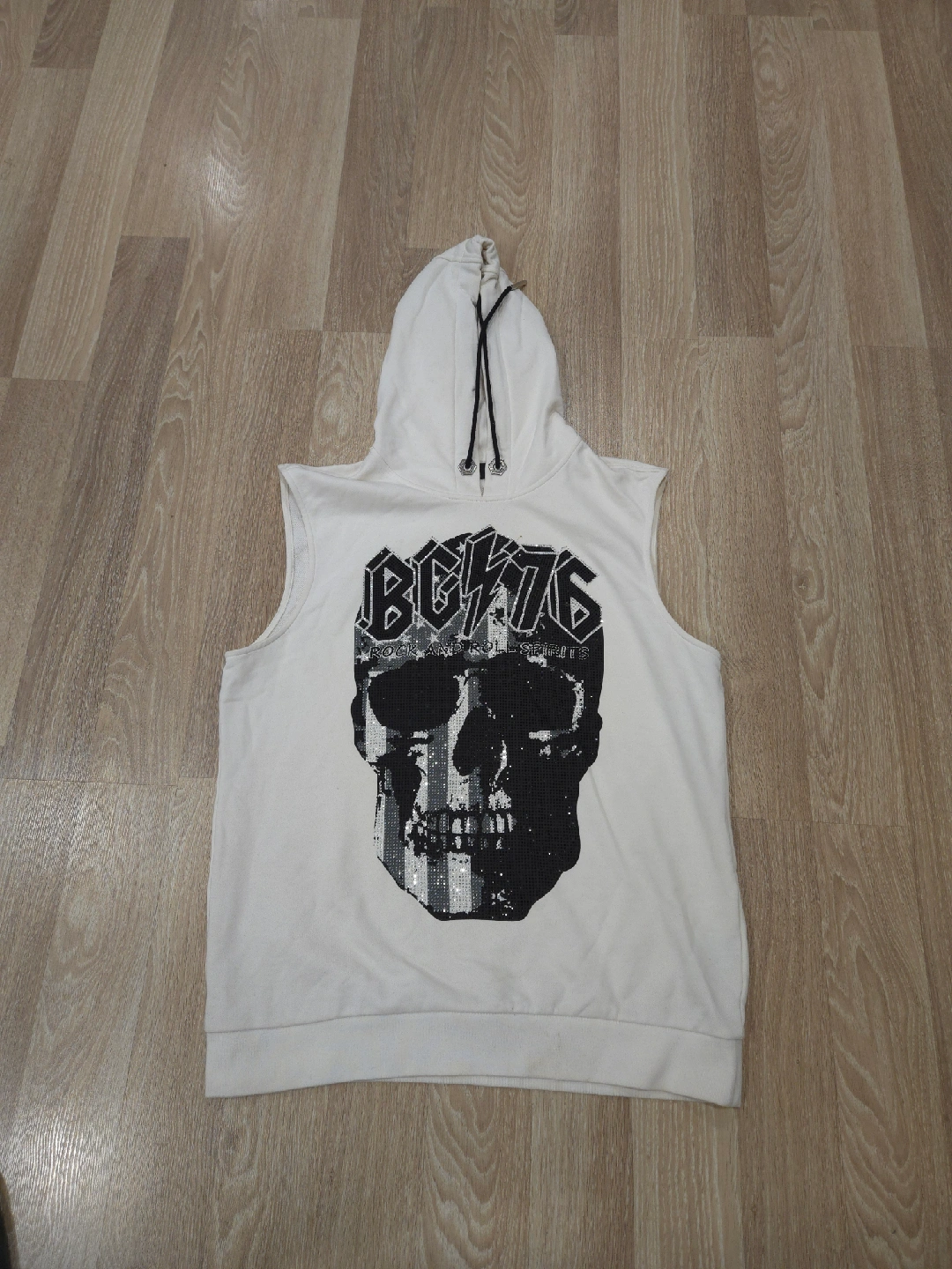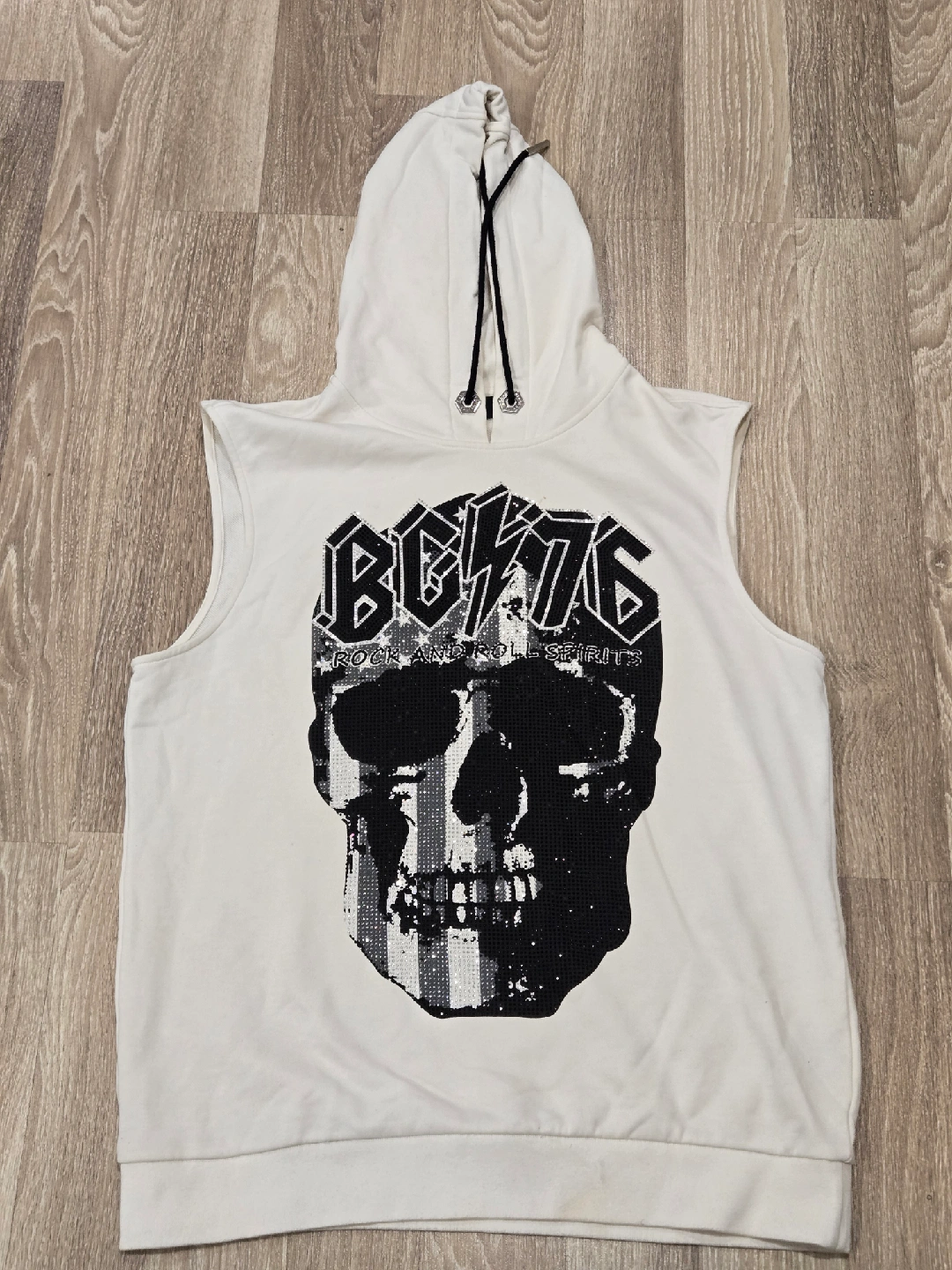 Selling a BGLE Italy sleeveless hoodie. It features a skull graphic on the front and cool text on the back. Size 52.