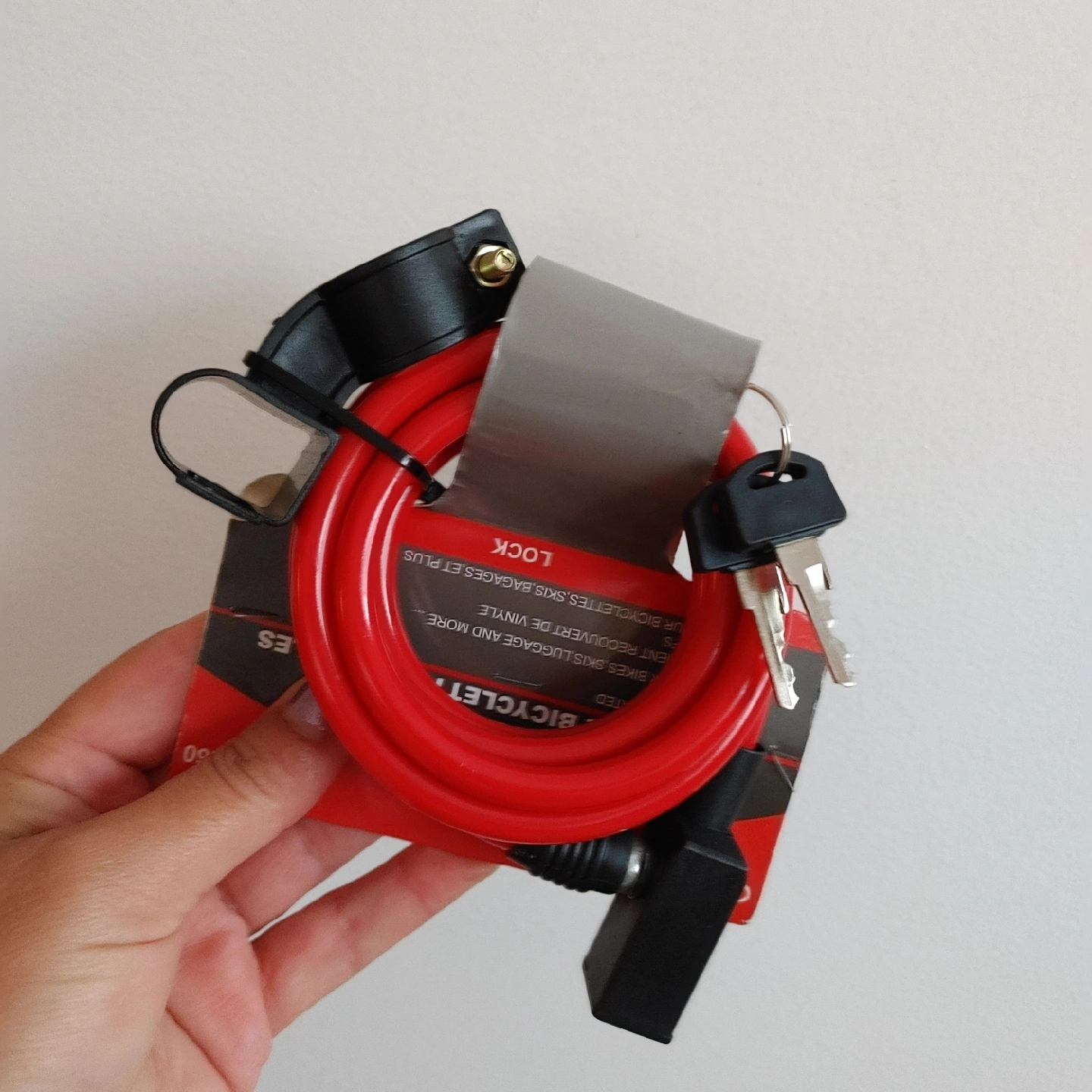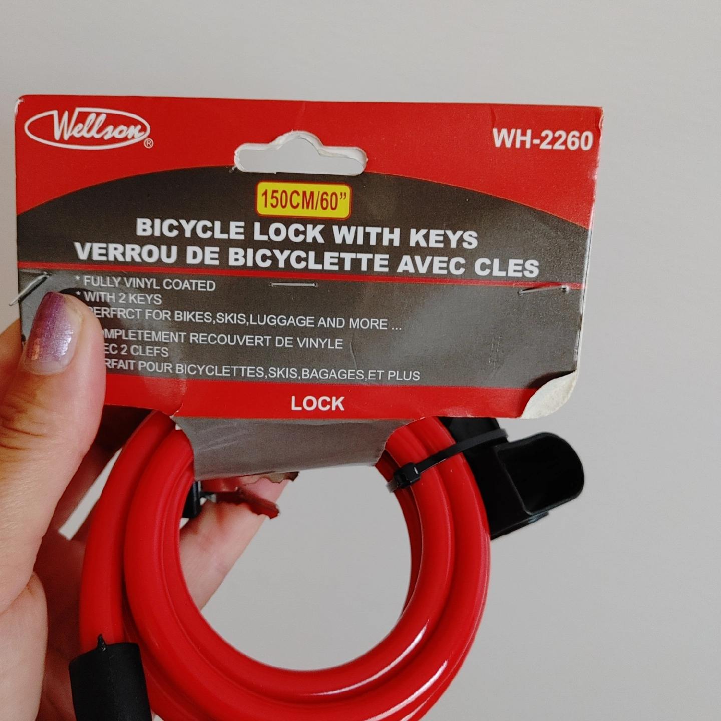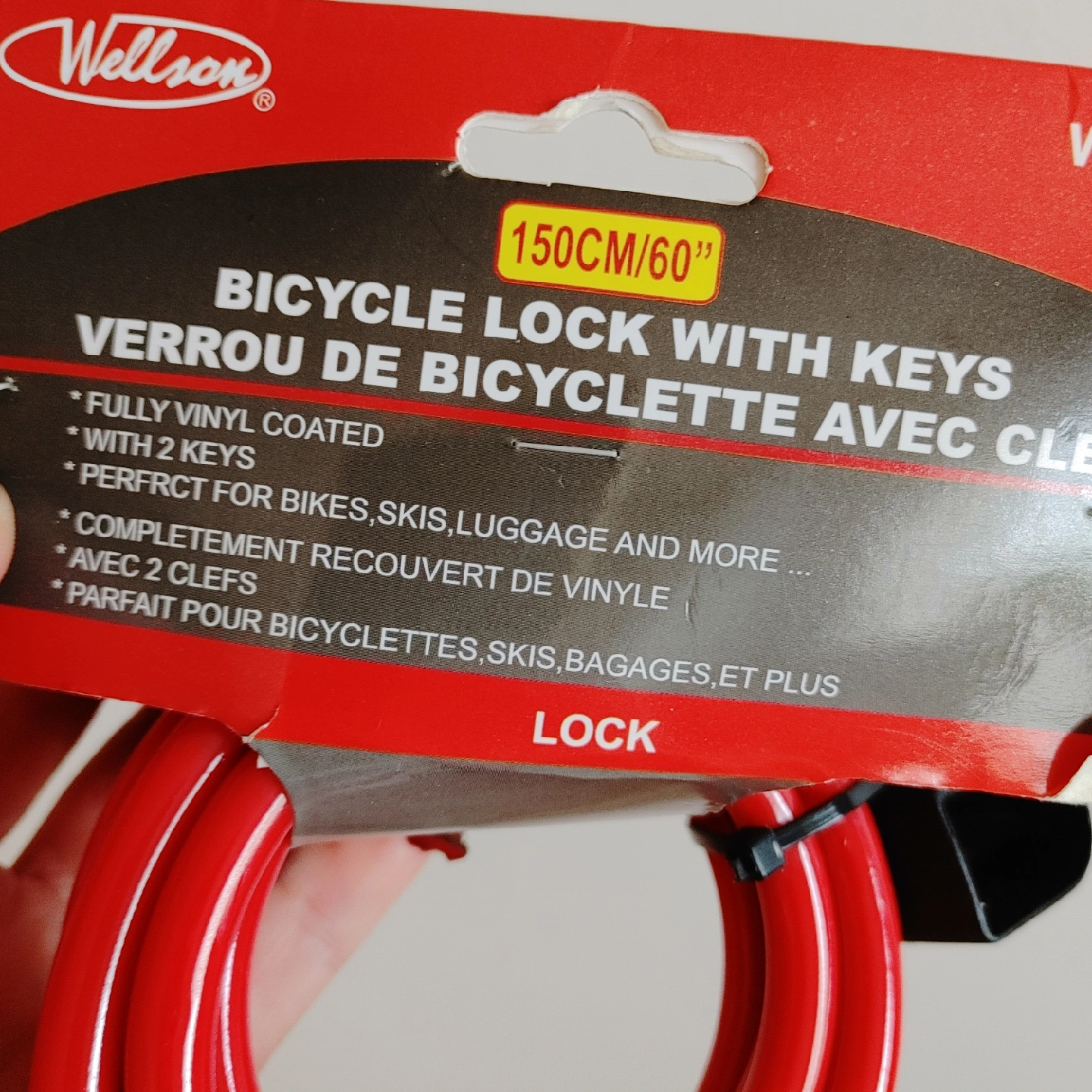 It's red and comes with two keys and bracket Perfect for bikes, skis, luggage and more! Fully vinyl coated.