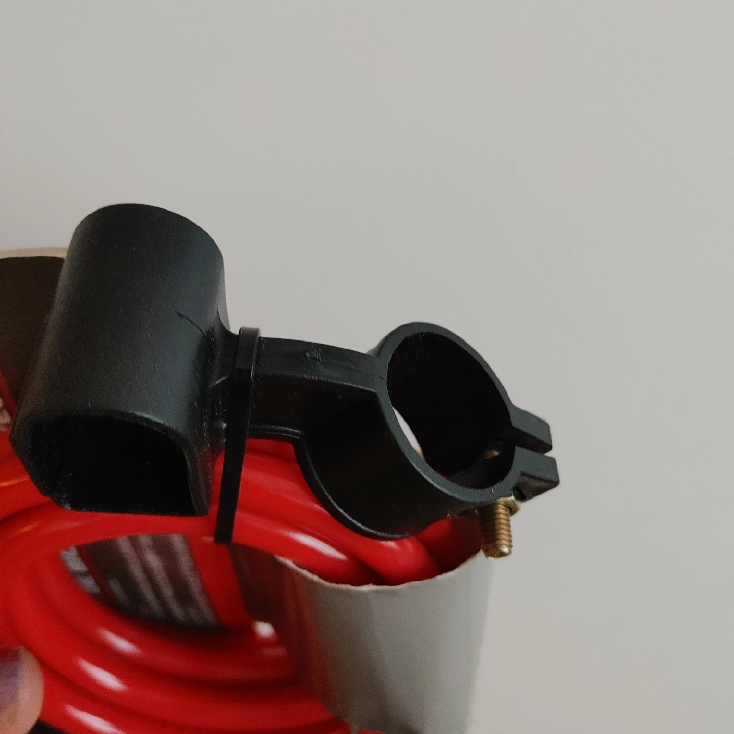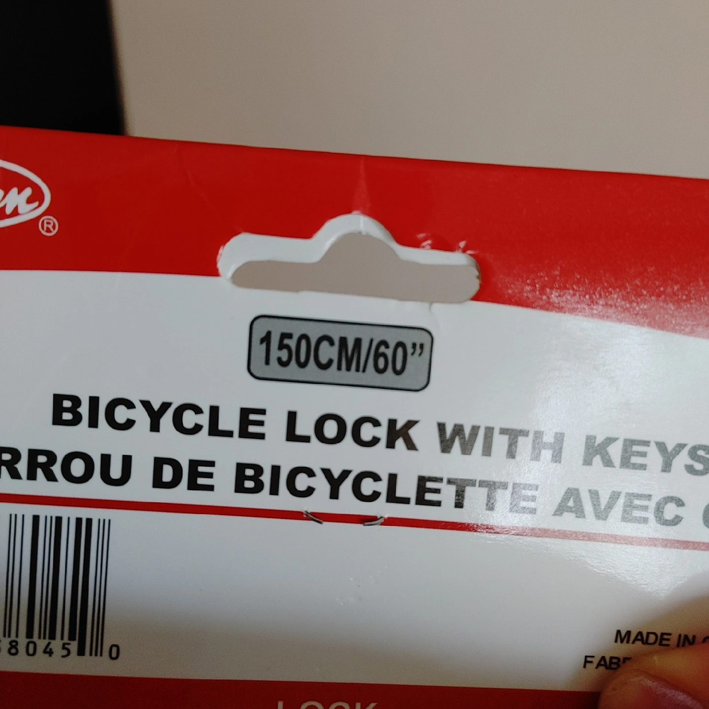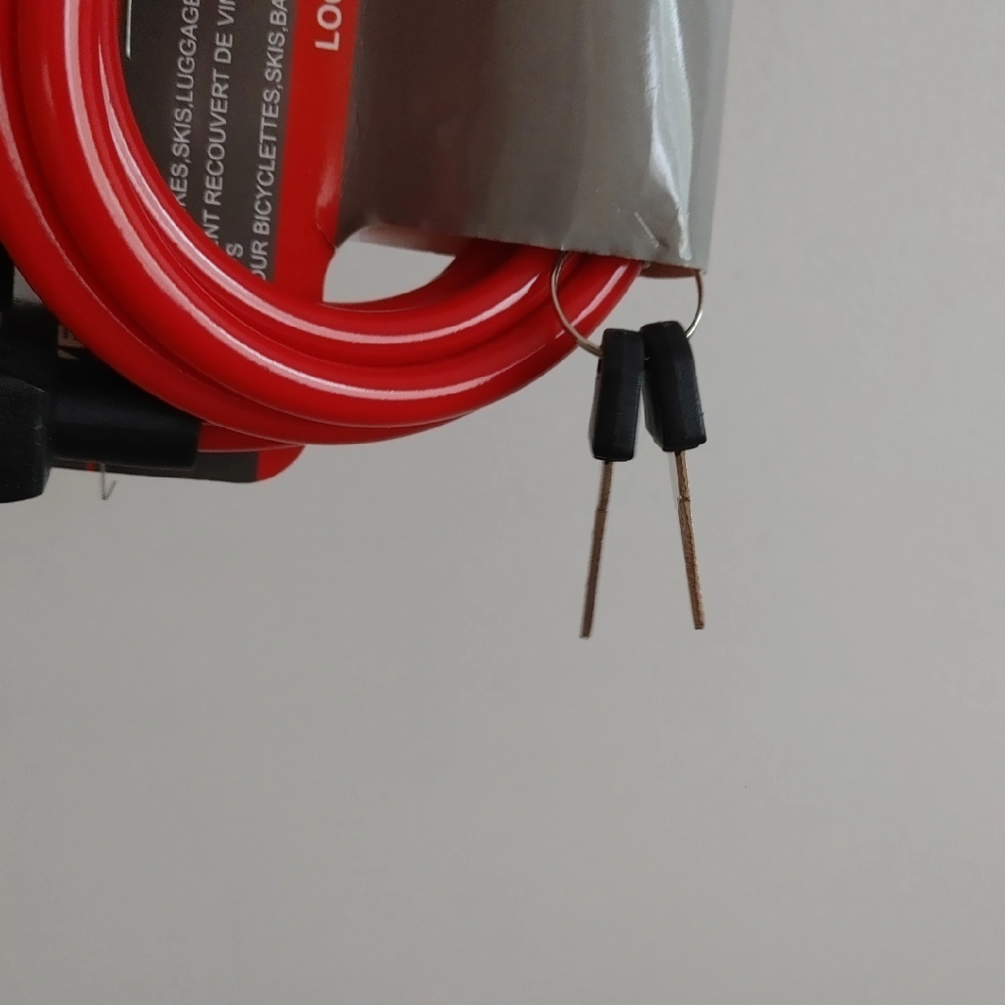 It's red and comes with two keys and bracket Perfect for bikes, skis, luggage and more! Fully vinyl coated.