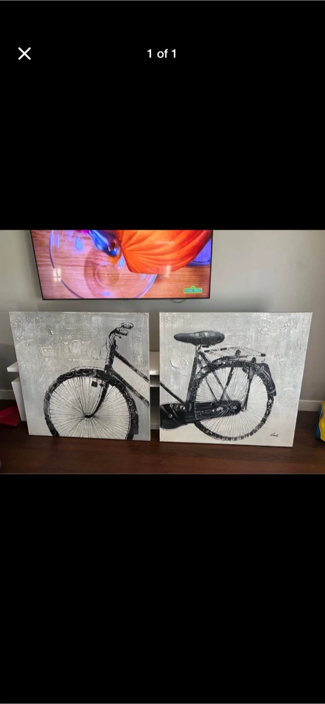 Selling a set of two canvas art pieces featuring bicycle wheels. They're in great shape and would add a unique touch to any room Don’t have the space anymore. My loss is your gain
