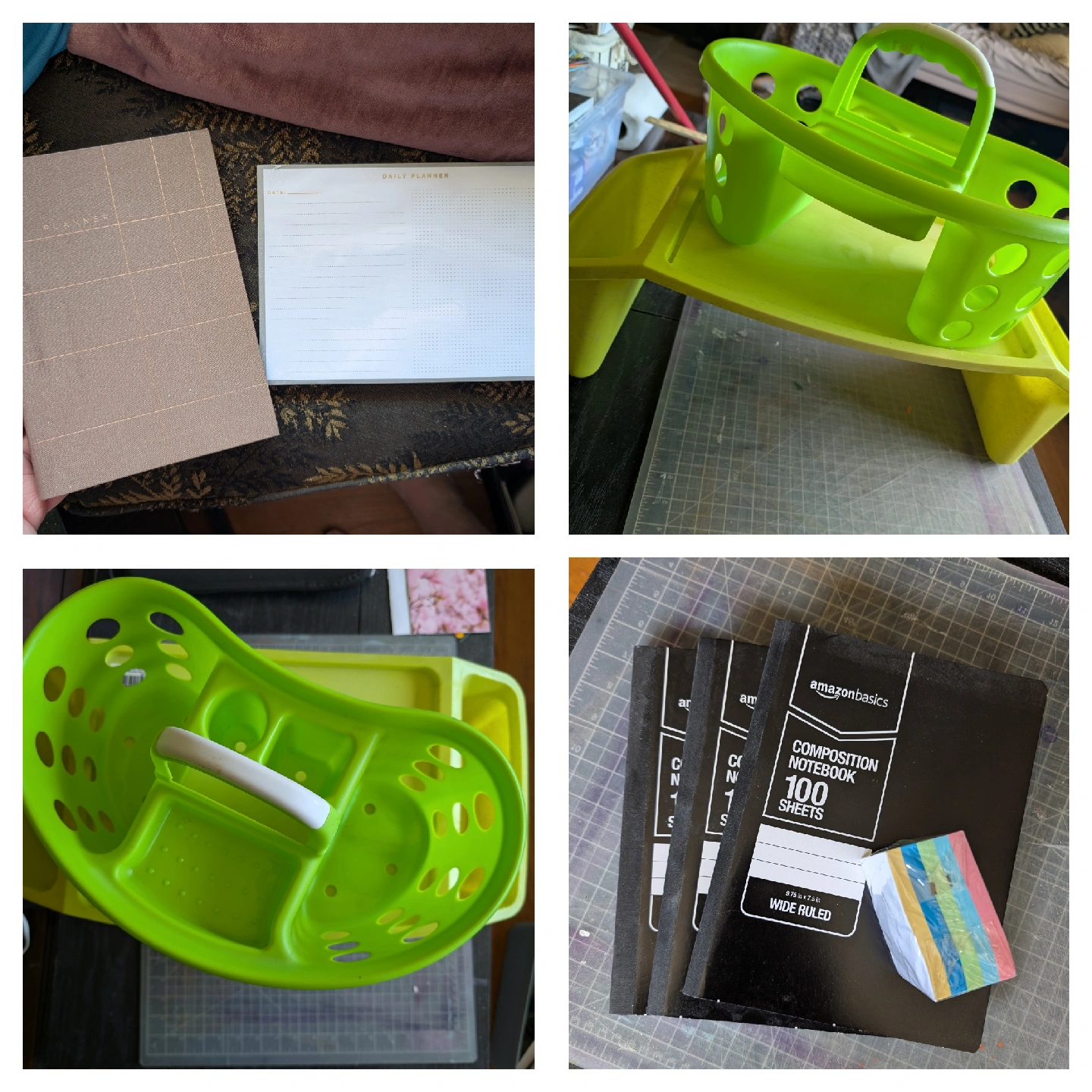 Most has never been used. Cleaning out all my old supplies from when I was in school. Some of what's included: - Metal/magnetic "cork board" with pins and magnets -Storage bins -Desk caddy and lap table -Paper and note taking supplies -Planner -Pencil case and bags -Small purses -Canvas Backpack -USB Lamp And more Adding to it as I find more.