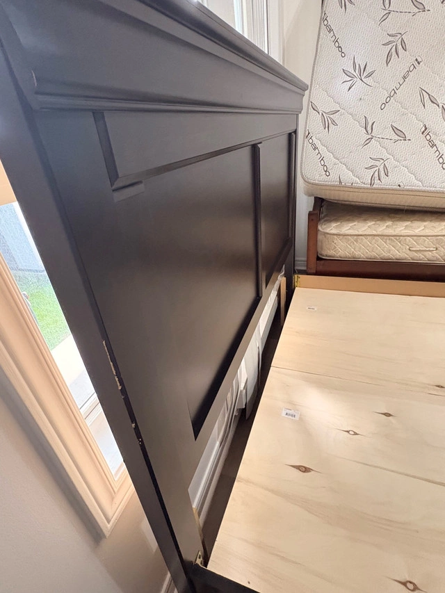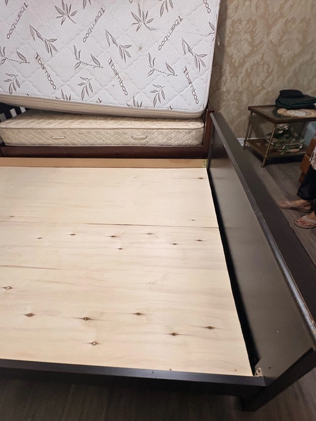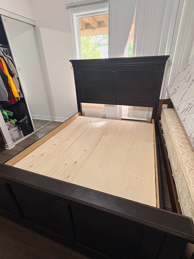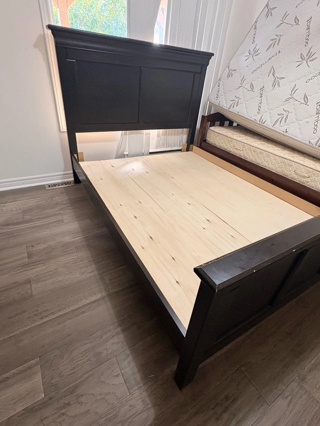 Upgrade your bedroom with this beautiful dark wood bed frame featuring a sturdy headboard and footboard. Size: Queen Material: Solid wood with a rich espresso finish Condition: Great – no cracks, very sturdy and stylish Includes: Wooden base panels (no box spring needed) Easy to assemble/disassemble Perfect for anyone looking for a durable, classy, and comfortable bed setup. Clean, pet-free, smoke-free home Can help with loading For Sale By: Business