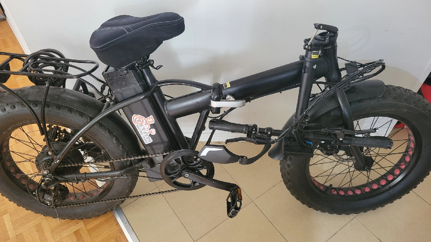 Selling a folding fat tire electric bike in black. Great for commuting or leisure rides! The fat tires provide excellent stability and traction on various terrains. It's easy to fold and store, making it perfect for small spaces or transporting in a car. Battery lights up but bike do not turn on. Bike does not turn on.