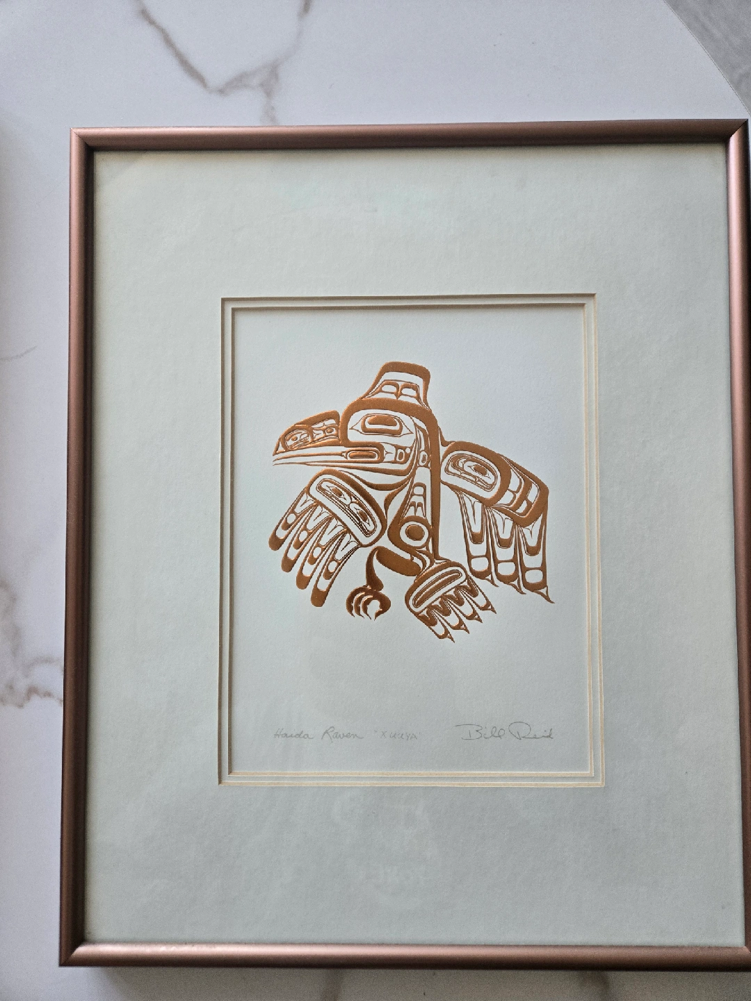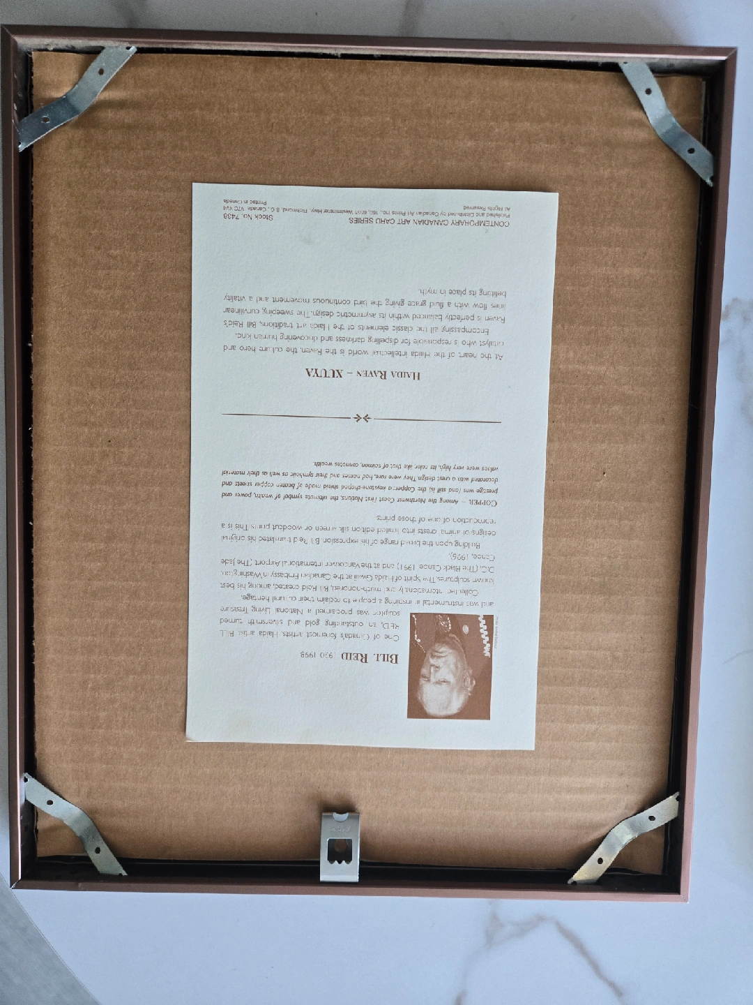 Beautiful framed print of Bill Reid's iconic Haida Raven design. It's part of the Contemporary Canadian Art Card Series. A lovely piece of art to add to your home!