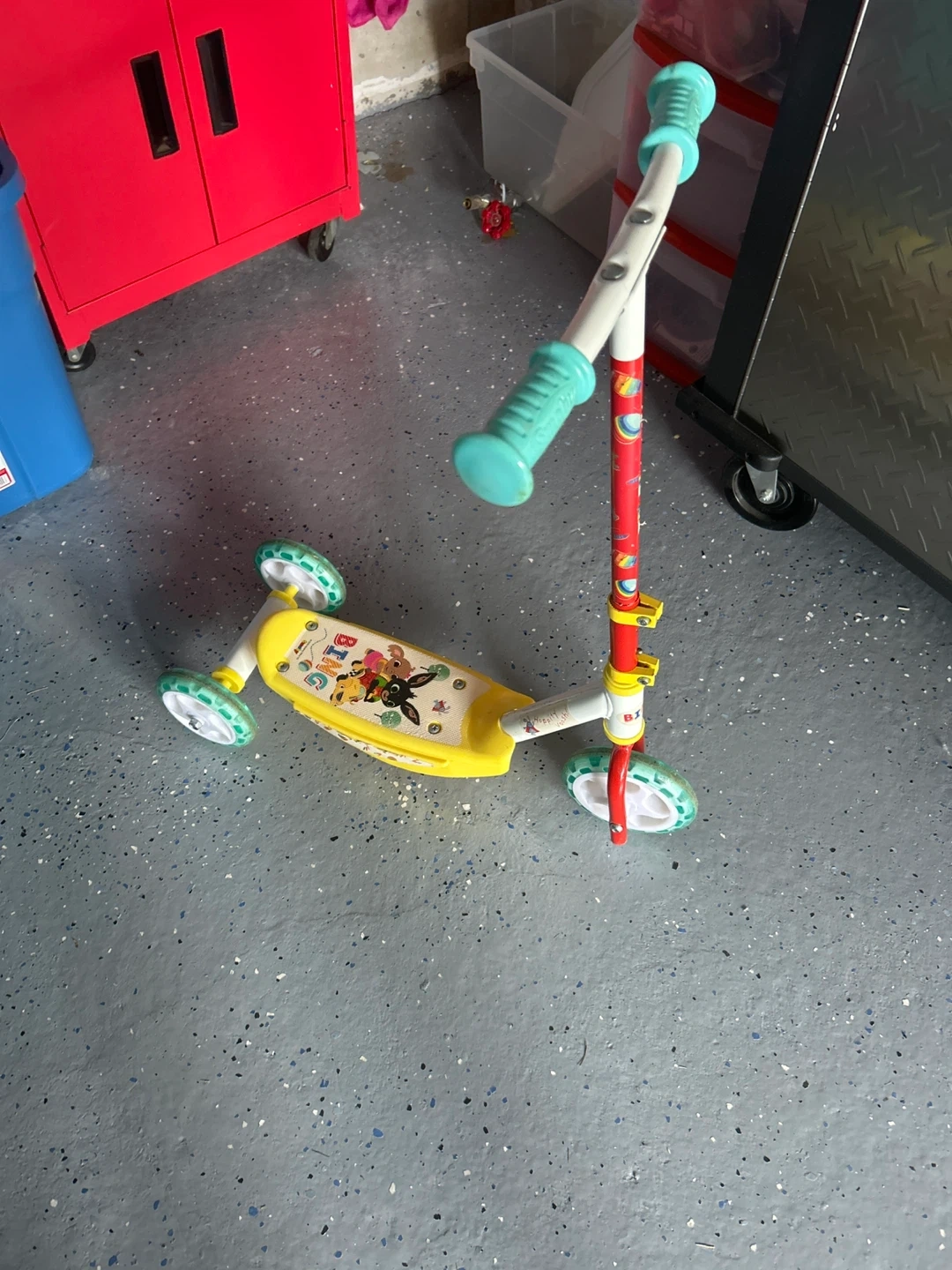 Selling a cute Bing-themed scooter for kids! It's yellow with Bing Bunny and friends graphics. Great for little ones learning to scoot around, and it's in good condition.
