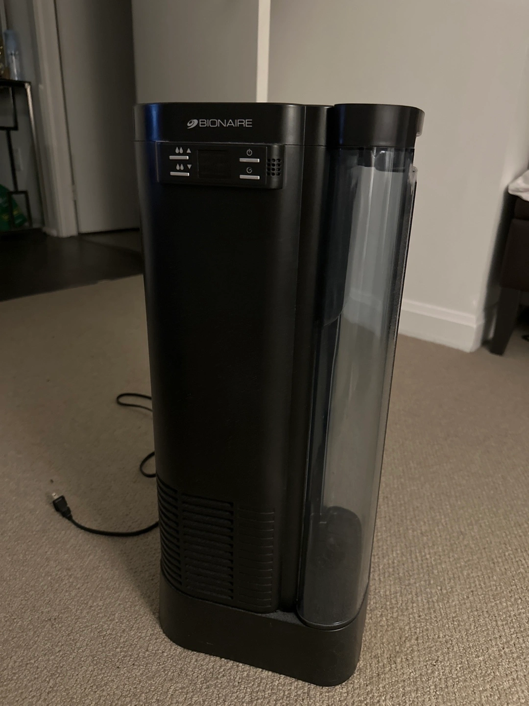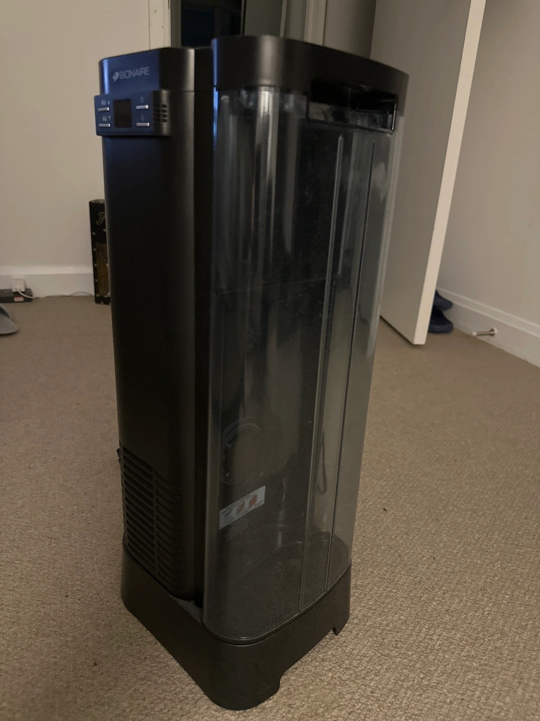 Bionaire brand humidifier. Black colour. Vertical design. Features a water reservoir and controls. Good for adding moisture to the air. Selling due to moving out of country.