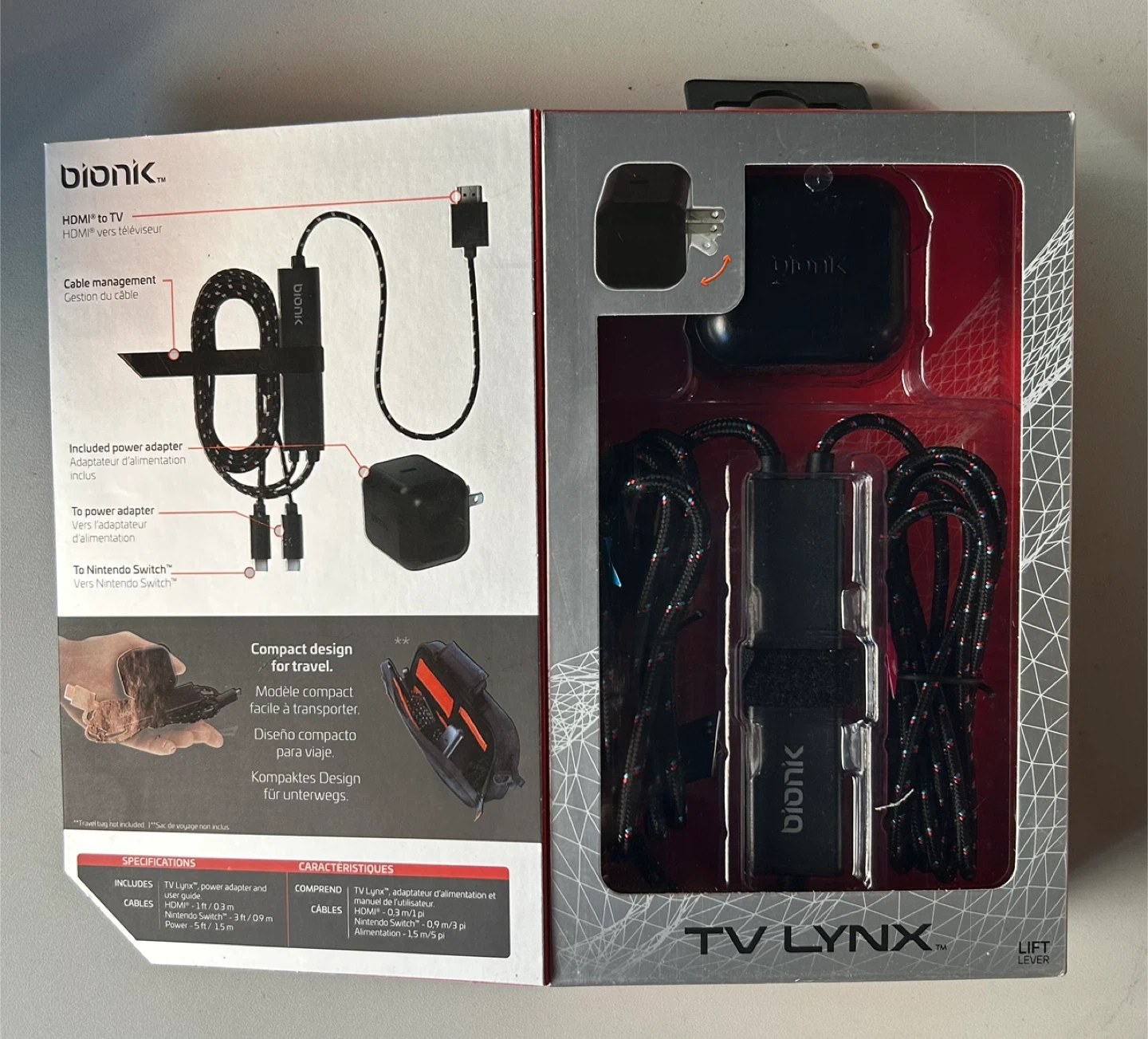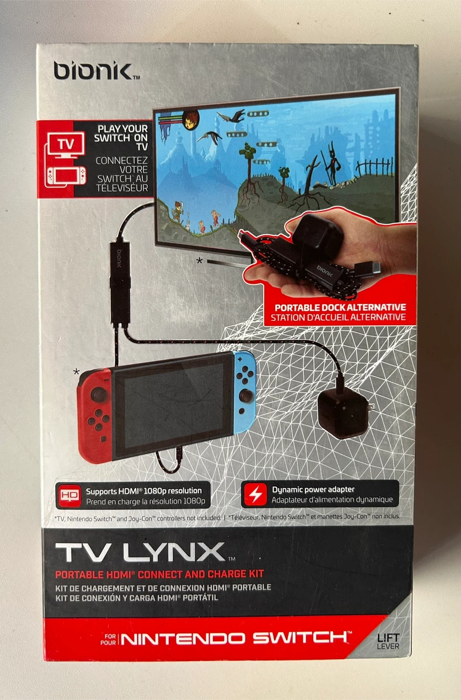Selling a NEW Bionik TV Lynx portable HDMI connect and charge kit for Nintendo Switch! It's a great portable dock alternative. The kit includes a power adapter and cables. With this kit, you can connect your Nintendo Switch to your TV via HDMI. It also includes a dynamic power adapter that optimally charges your device while allowing for TV mode in 1080p resolution.