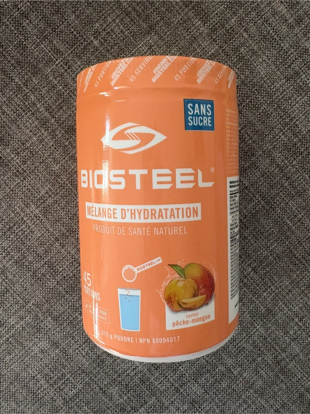 Selling a BioSteel Hydration Mix in peach mango flavour. It's a natural health product that's sugar-free. Contains 45 servings. It has a powder form with 315 g. Key ingredients include vitamins, minerals, and amino acids for hydration and overall well-being Never open Nepean