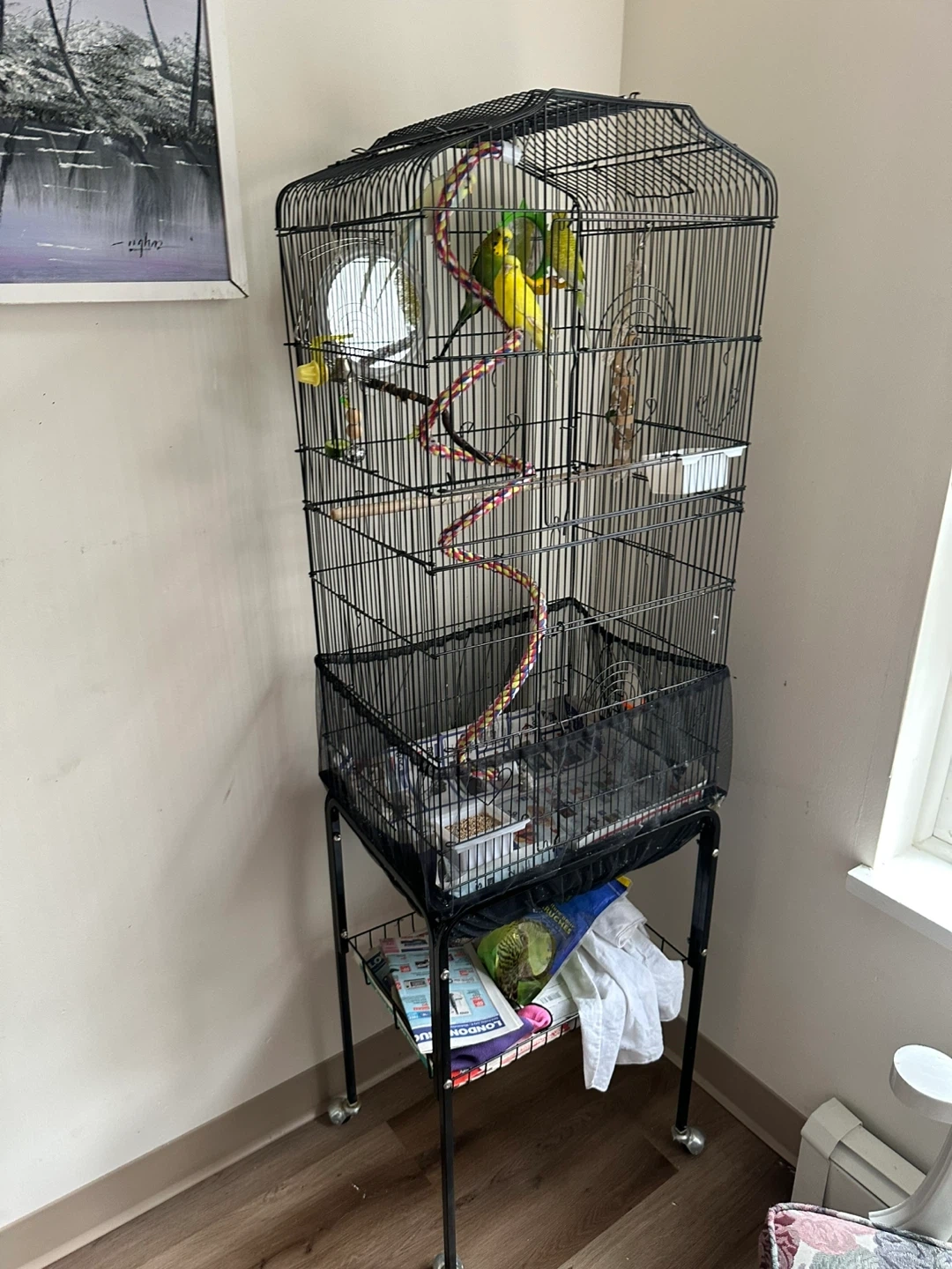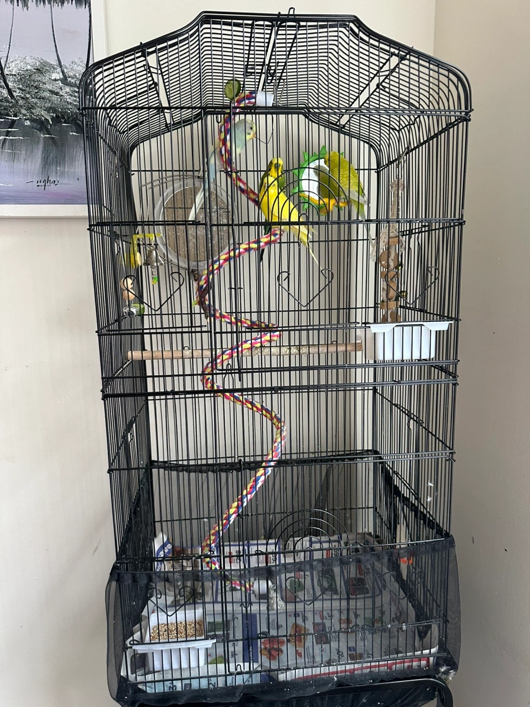 Selling a bird cage with a stand. It's in good condition and ready for a new home for your feathered friends! Includes perches and toys.