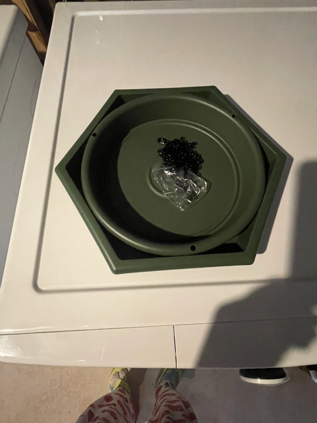 Selling a hexagon-shaped tray, it's a nice green colour and comes with a set of black chains in a sealed bag . This is for feeding the birds.