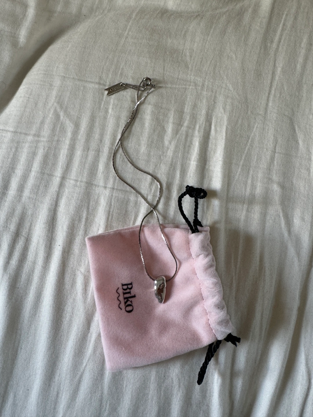 Silver necklace with a unique pendant. Delicate chain. Comes in a pink pouch. Pick up in downtown is available.
