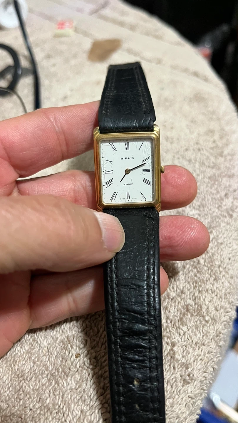 Selling a Birks quartz watch with a black leather strap. The back is stainless steel. It has a classic look! It has a new battery