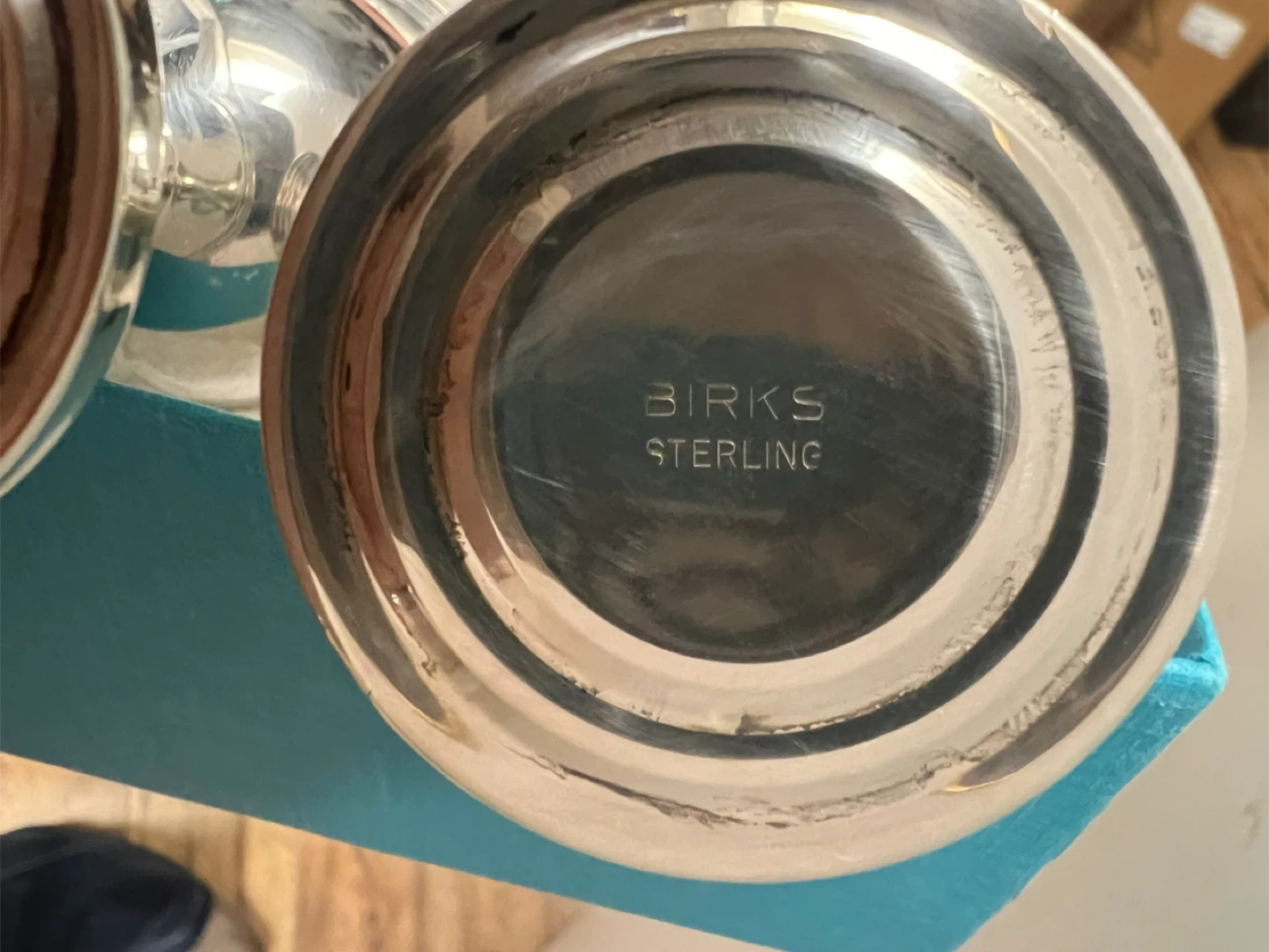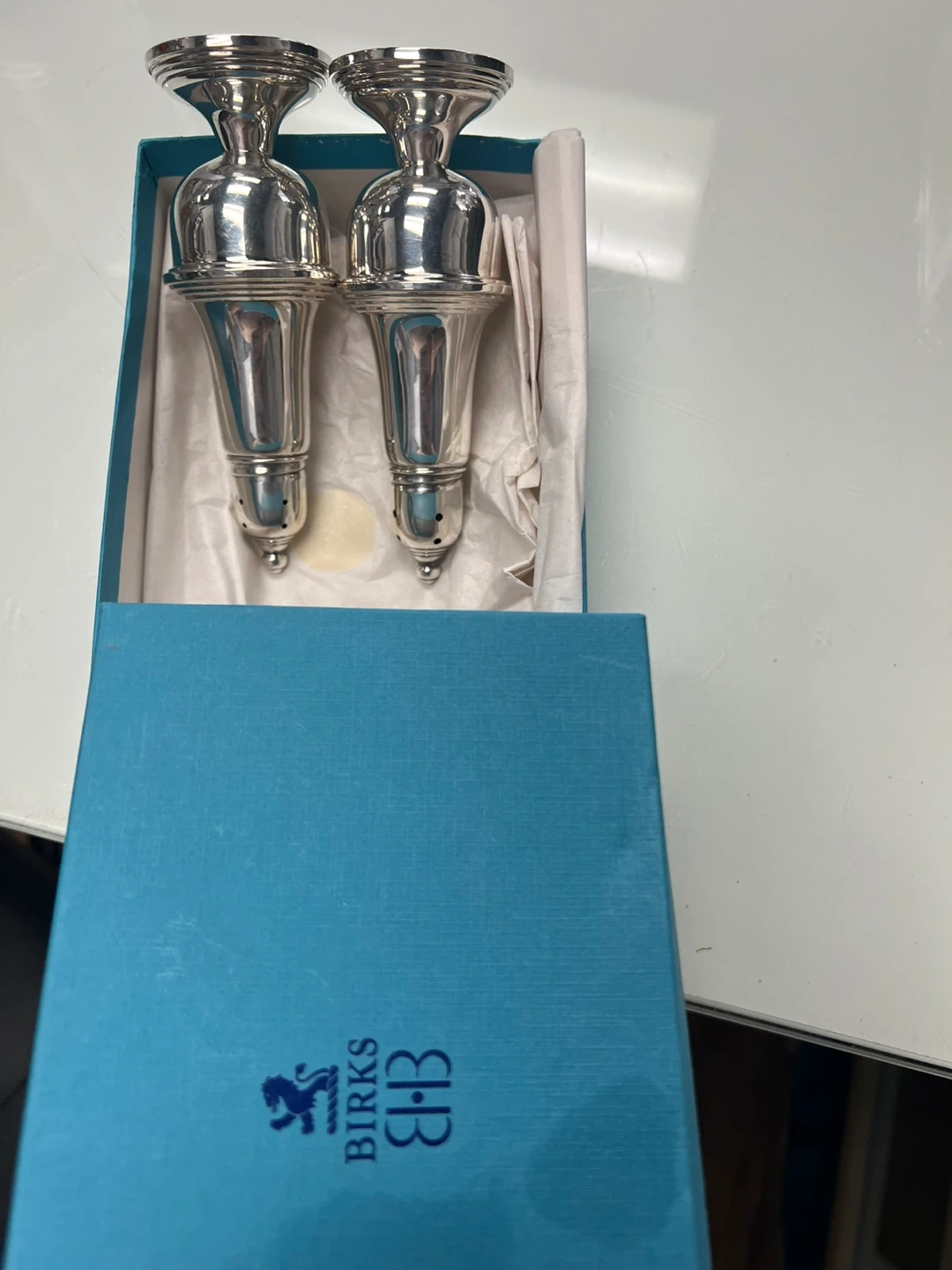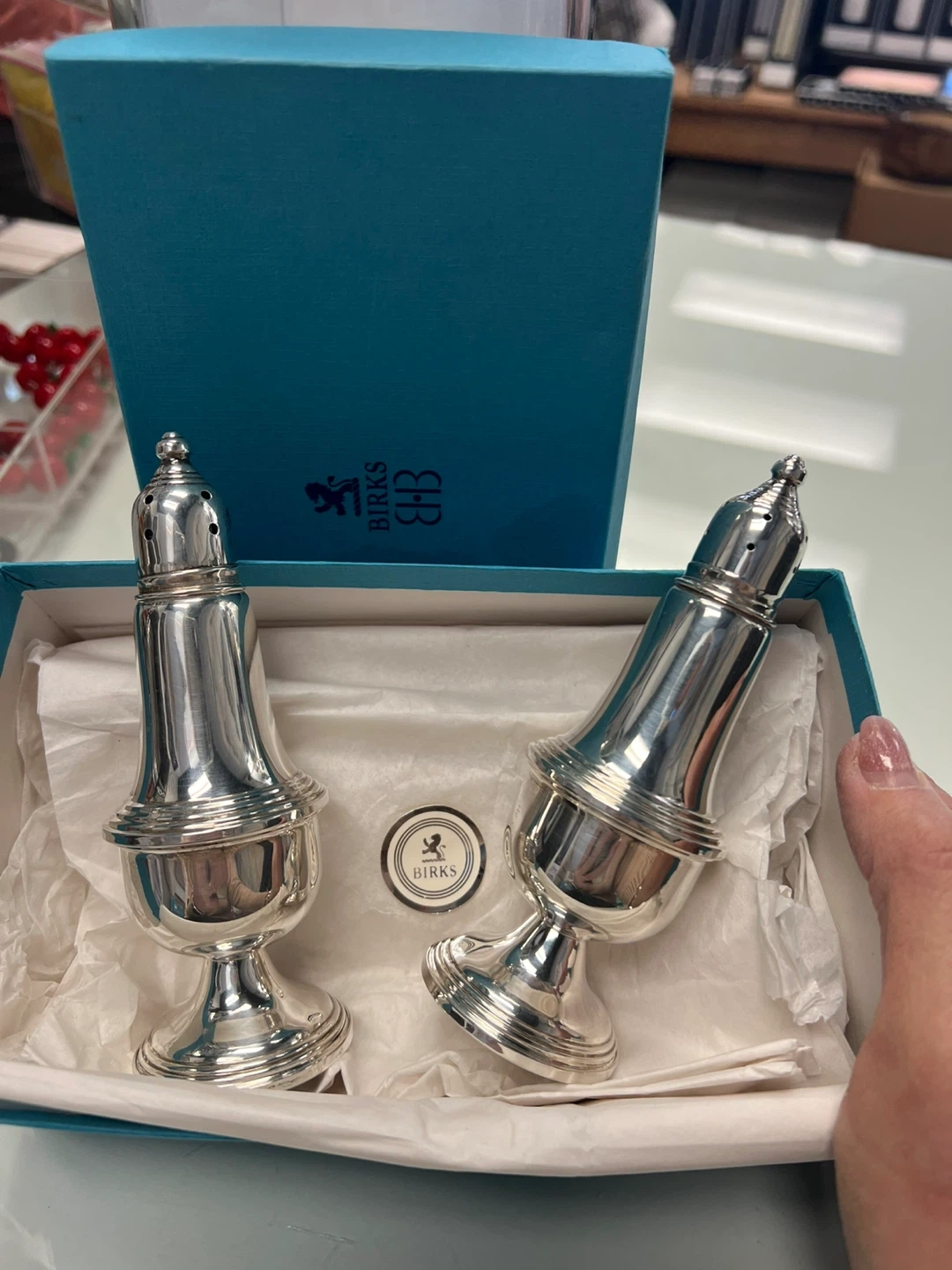 Selling a beautiful set of Birks sterling silver salt and pepper shakers! They come with their original box and Nevet Been used . Perfect for adding a touch of elegance to your dining table.
