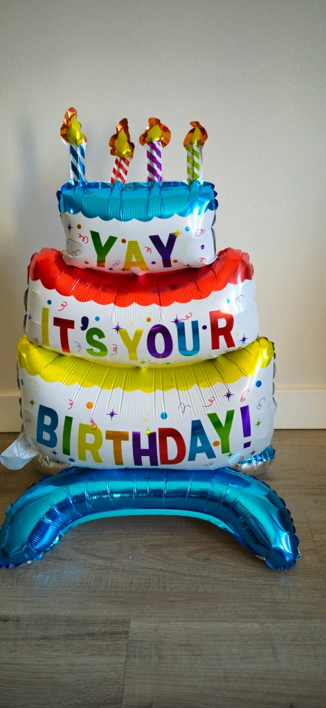 A fun and festive birthday cake balloon decoration! This balloon is shaped like a three-tiered cake with candles on top and a base to help it stand. It says 'YAY' and 'IT'S YOUR BIRTHDAY!' in colourful letters. Perfect for adding a celebratory touch to any birthday party