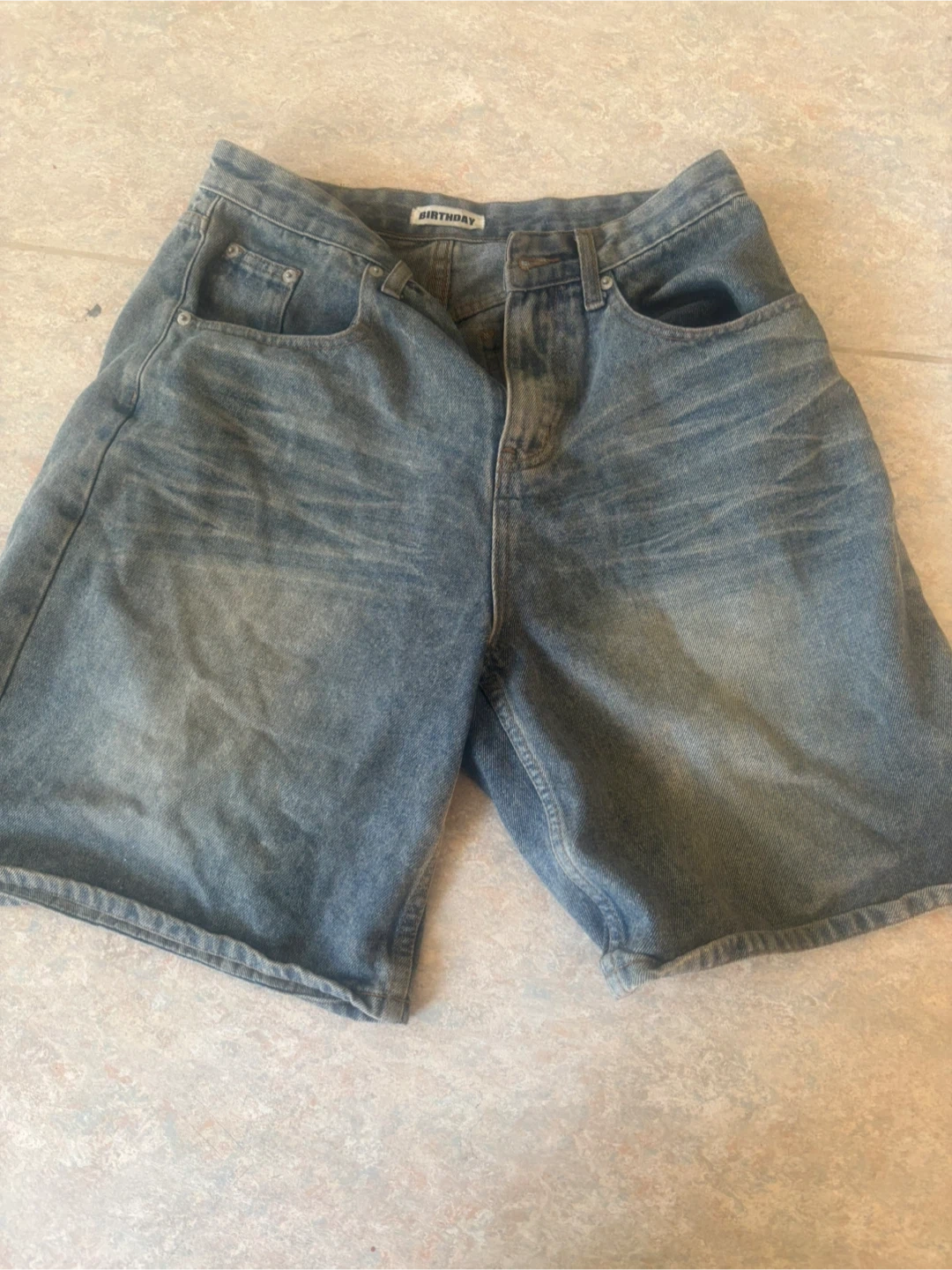 These are a pair of denim shorts from the brand Birthday. They are a light wash denim material. Size m