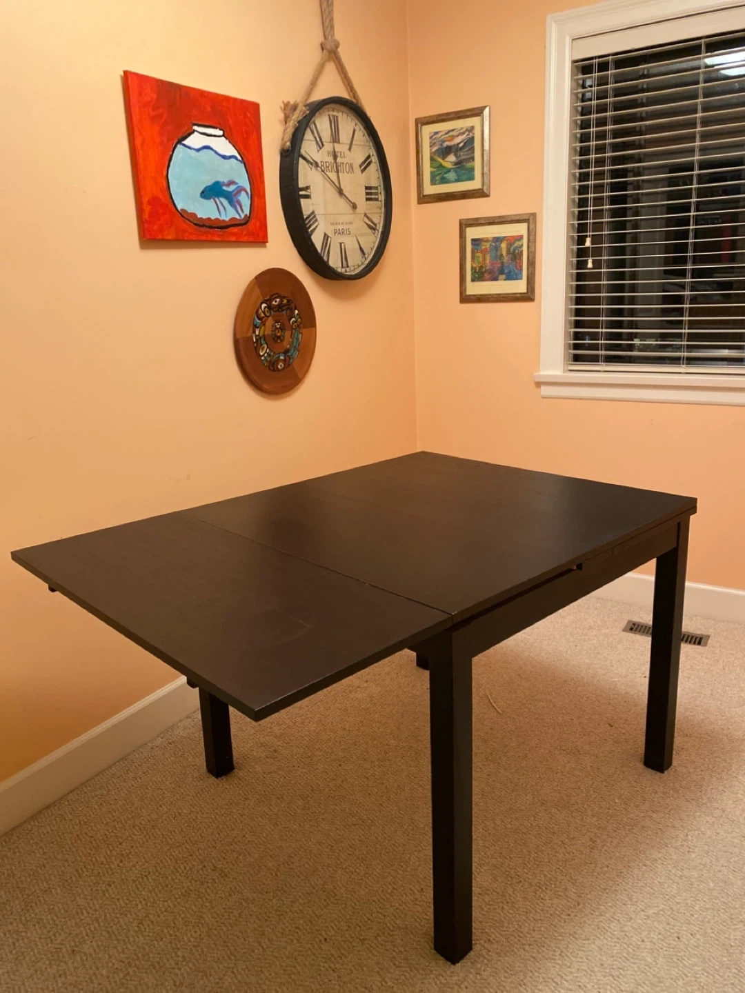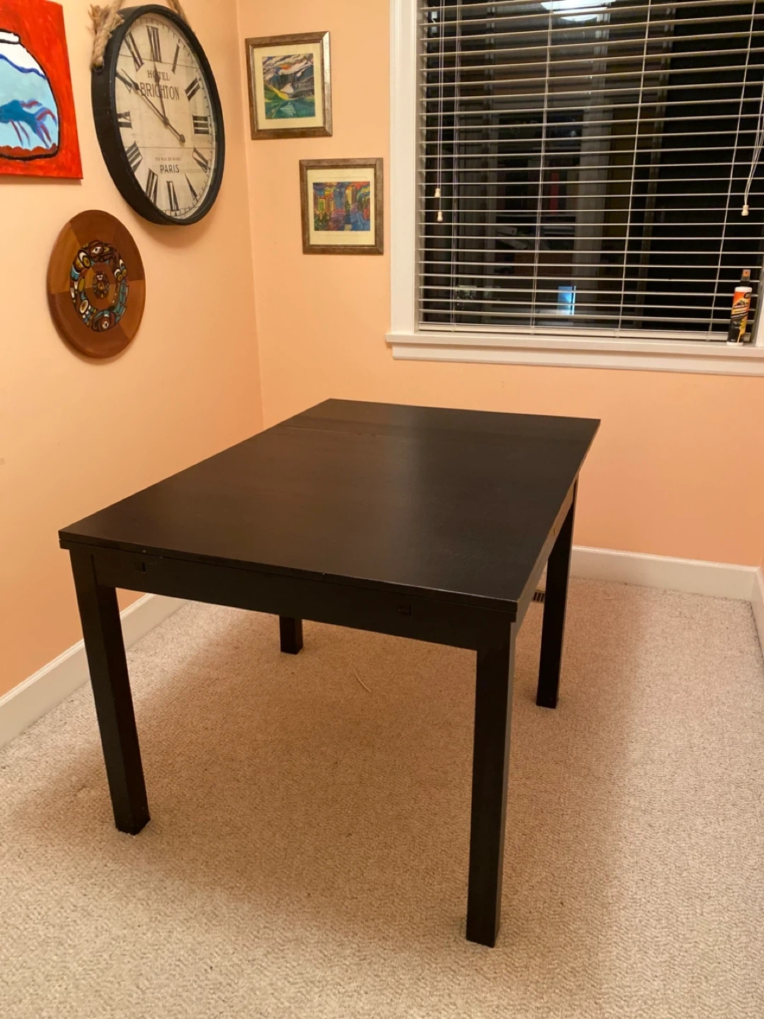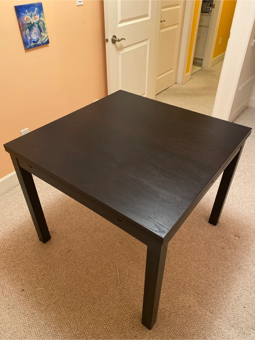 Selling BJURSTA rectangle, dark brown extendable dining table. It's in good condition and perfect for small spaces or for when you need extra room for guests. The table is a dark colour and has a simple, modern design. Product dimensions Length: 50 3/4" Min. length: 35 3/8" Max. length: 66 1/8" Width: 35 3/8" Height: 29 1/8" Length: 129 cm Min. length: 90 cm Max. length: 168 cm Width: 90 cm Height: 74 cm