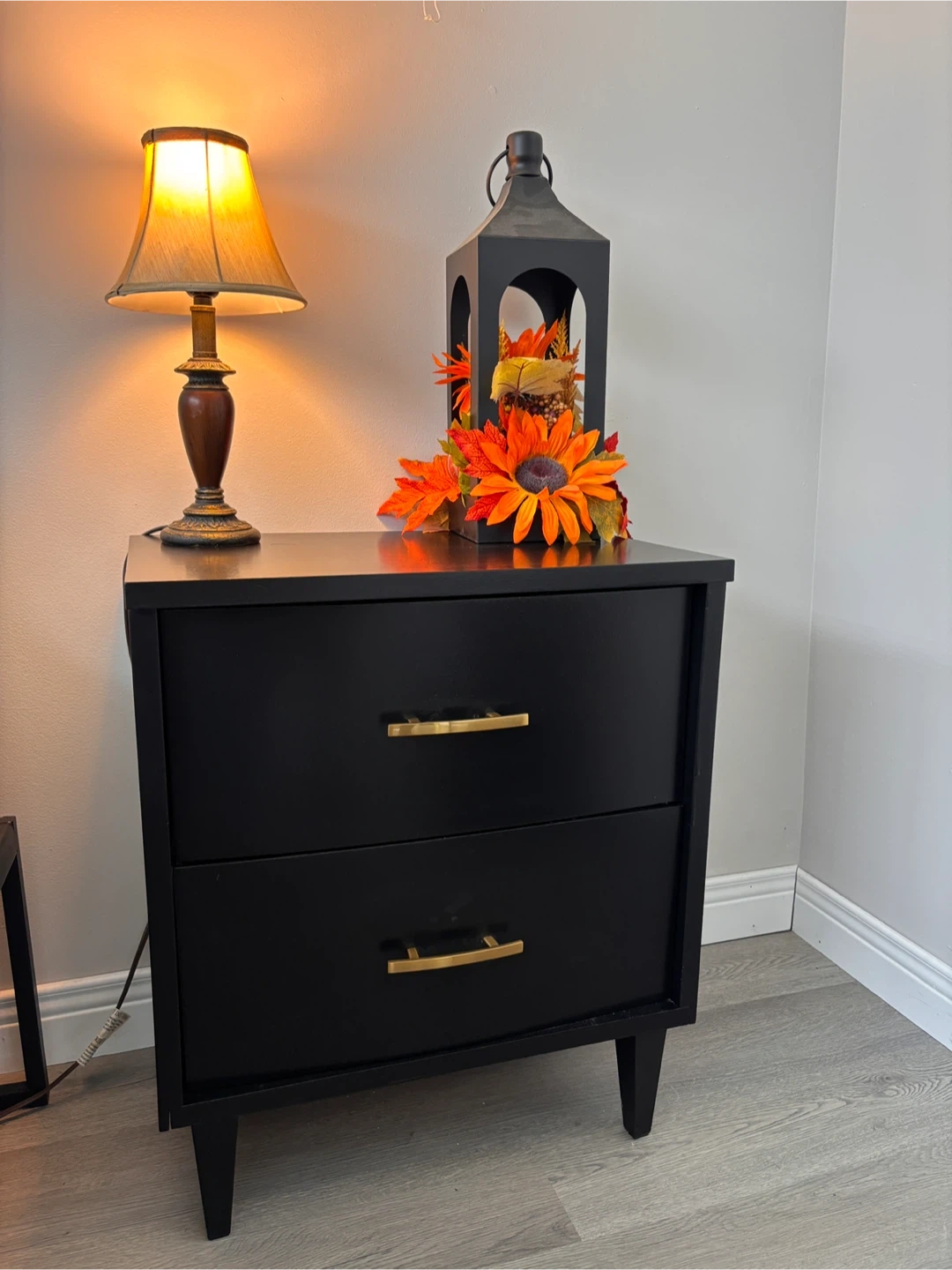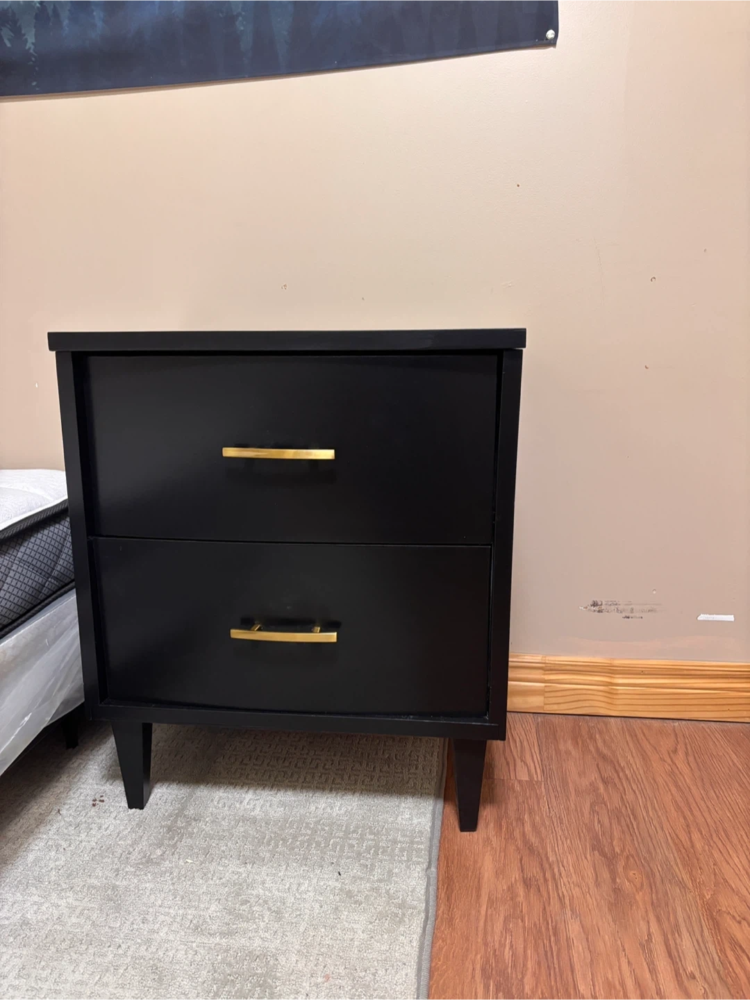 Selling a sleek black nightstand with two drawers. Newly refinished and would look lovely in any bedroom. The gold-tone handles add a touch of elegance