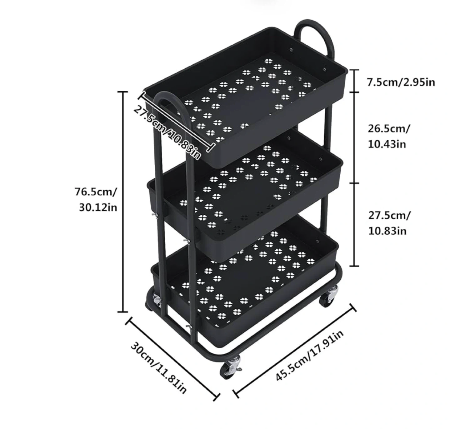 Looking to declutter? This black 3-tier rolling utility cart is perfect for adding extra storage to any room! It's great for organizing books, office supplies, kitchen items, or anything else you need to keep tidy. The cart is easy to move around thanks to its smooth-rolling wheels. Dimensions are approximately 30.12 inches (height) x 17.91 inches (length) x 11.81 inches (width).