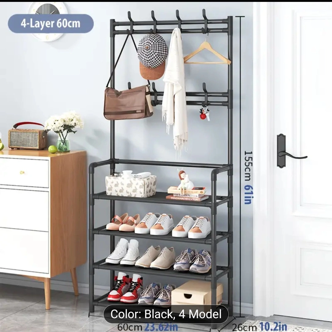 This is a 4-layer coat rack with shoe storage. It's black and measures 60cm (23.62in) wide and 155cm (61in) tall. The depth is 26cm (10.2in). It's a great way to organize your coats, hats, bags, and shoes! Still in box (not assembled). Never used.