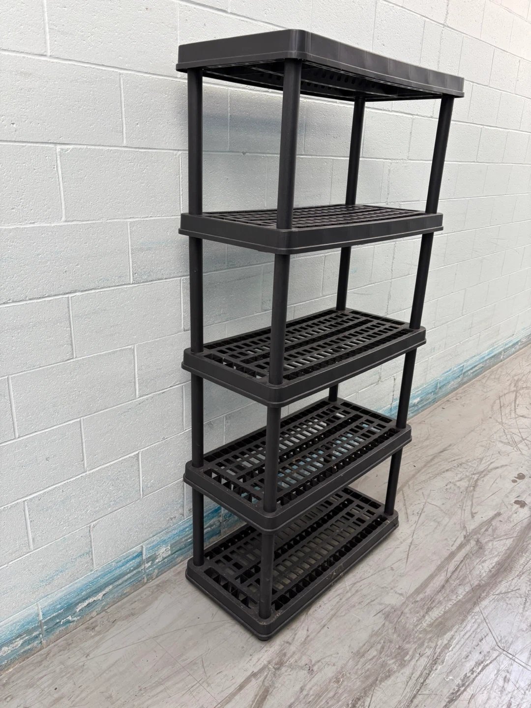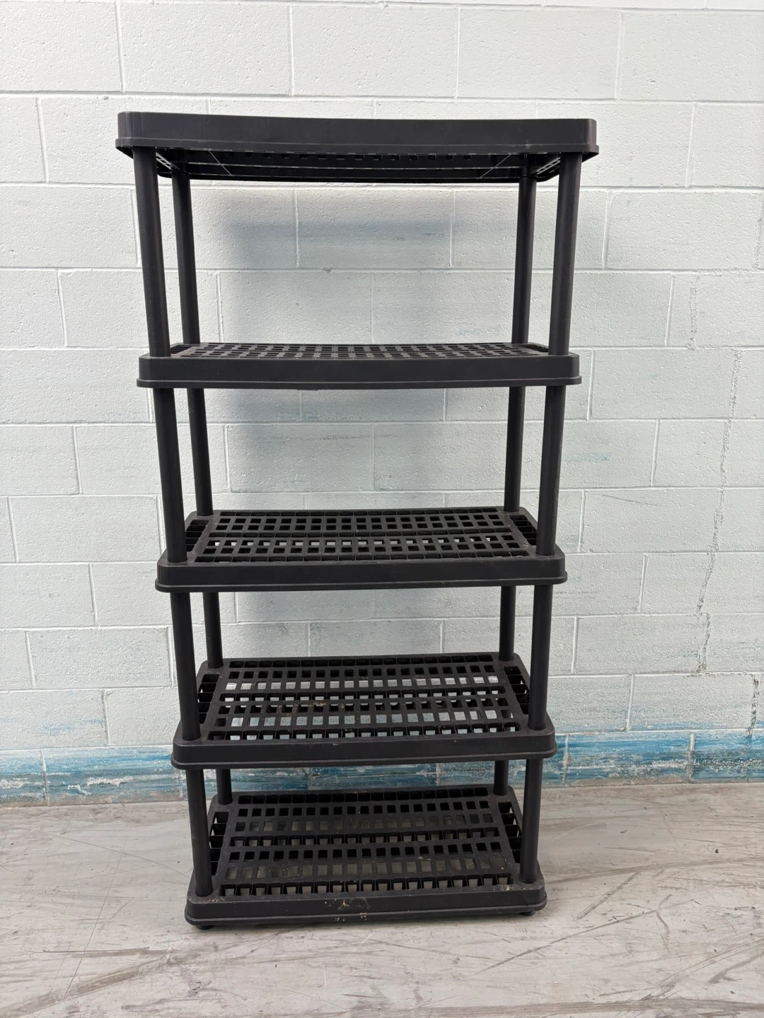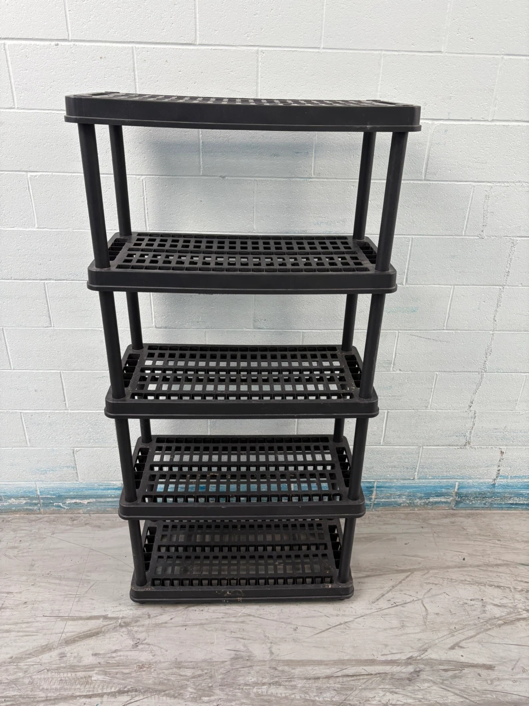 🧡good condition Black 5-Tier Plastic Shelf Selling a black plastic shelf with 5 tiers. It's in great condition and perfect for organizing your space! Great for the garage, basement, or anywhere you need some extra storage Measurements in last couple of pics $20 Pick up Victoria Park & O’Connor area