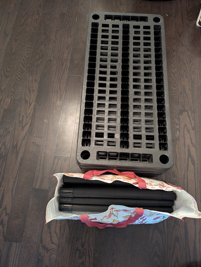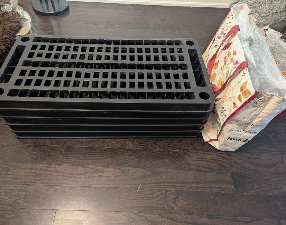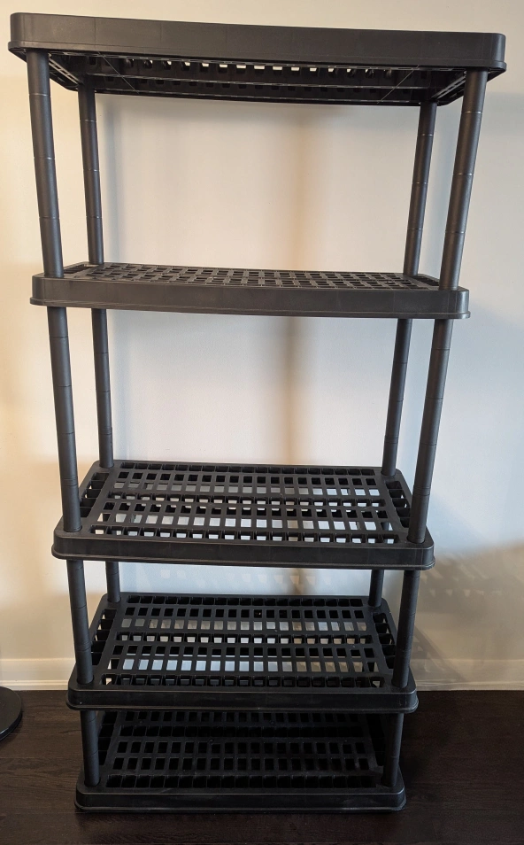 Selling a handy 5-tier plastic shelving unit in black. It's great for organizing items in your home, garage, or storage room. It's lightweight and easy to assemble, and it can hold a surprising amount of weight. All the pieces are included! Dimensions - 6ft x 16in x 34in