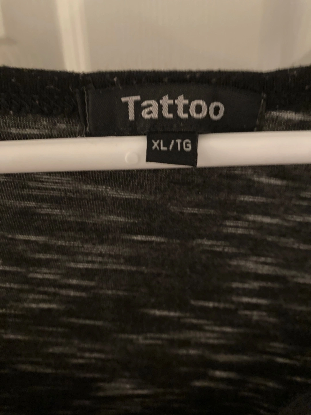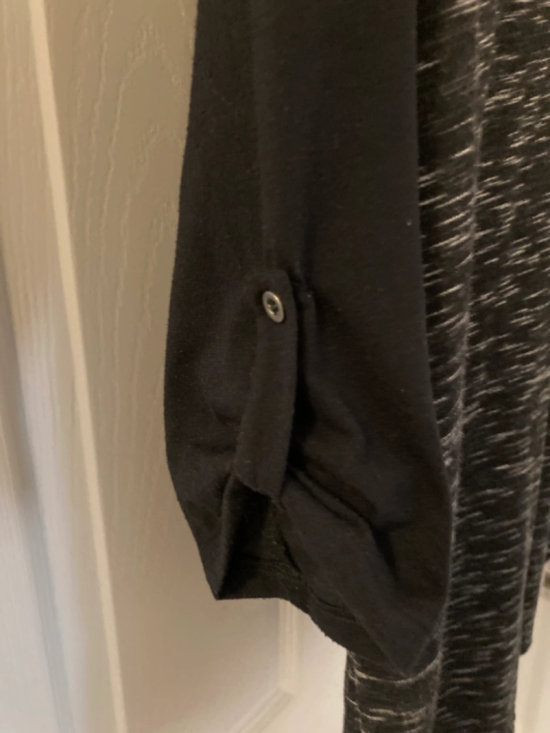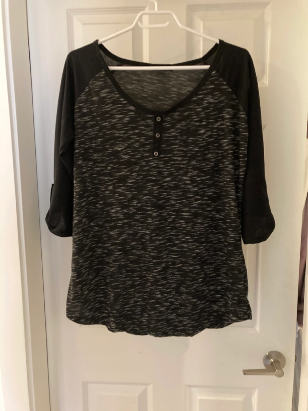 Black and grey henley top. Three-quarter sleeves. Size XL/TG. Features a henley placket and roll-tab sleeves.
