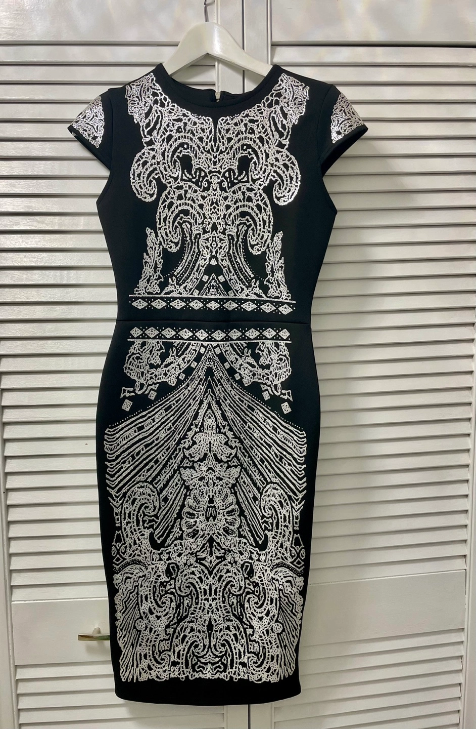 Black dress with silver embellishments. Fitted and knee length. Short sleeves. Zipper in back. Worn once. Really nice by Riverisland.
