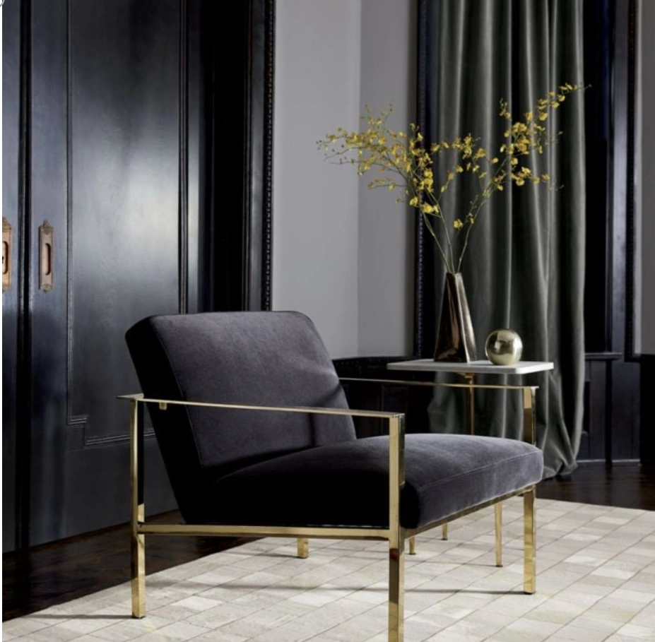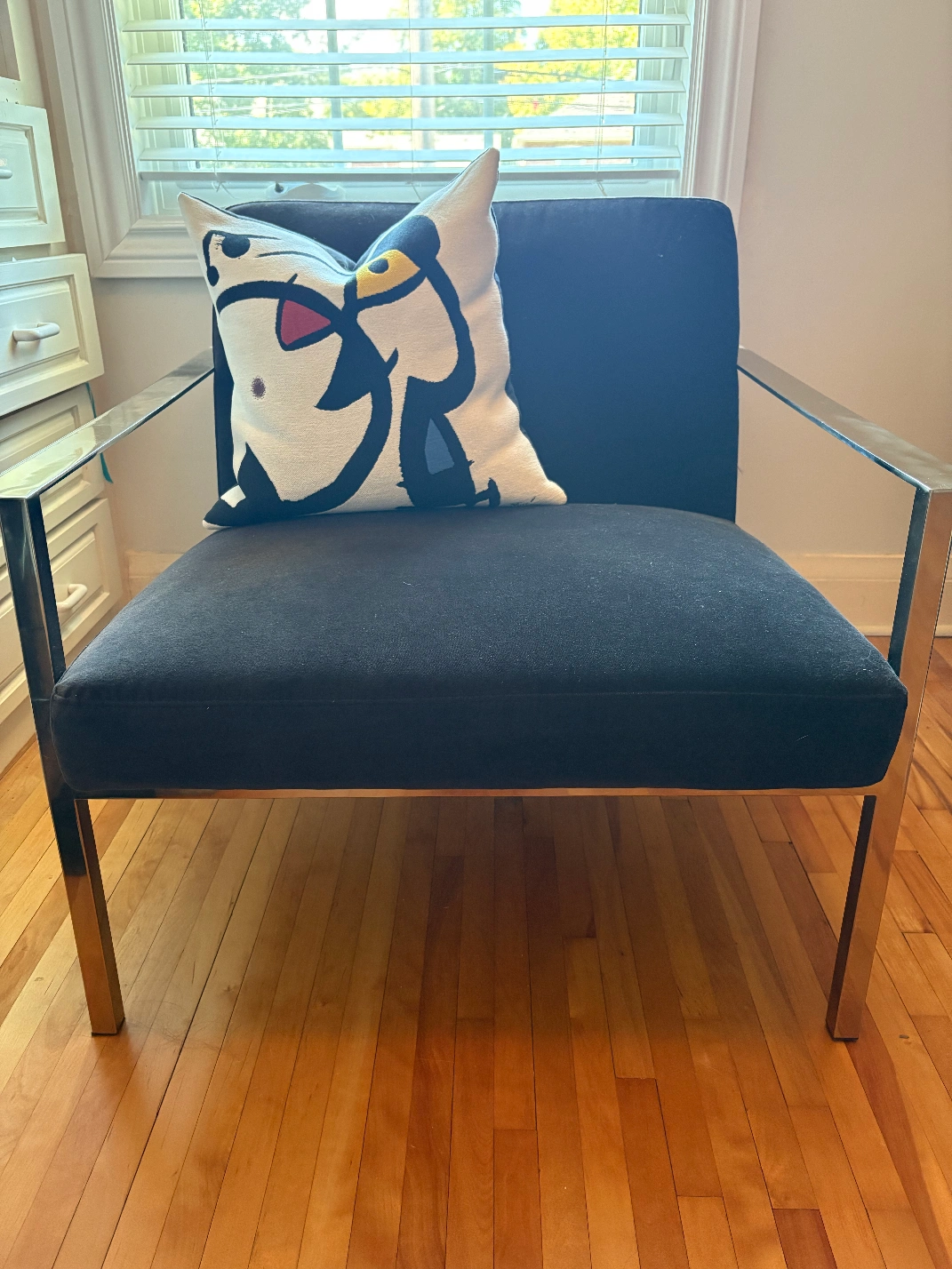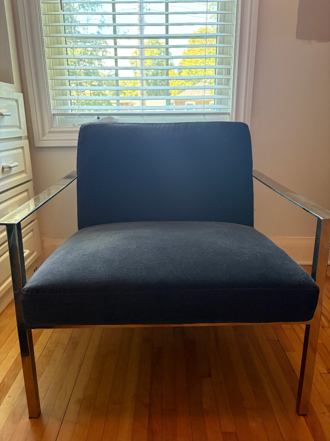 This is the Cue Carbon Chair from CB2 which retailed for $1300, but is now out of stock. This is a stylish modern armchair with a carbon black cushion and a sleek stainless steel metal frame. It's designed by Mermalada Studio and 100% plush polyester. Some minor scratches on the arm (see photo). Dimensions: 33.75" W x 31.75" D x 30" H