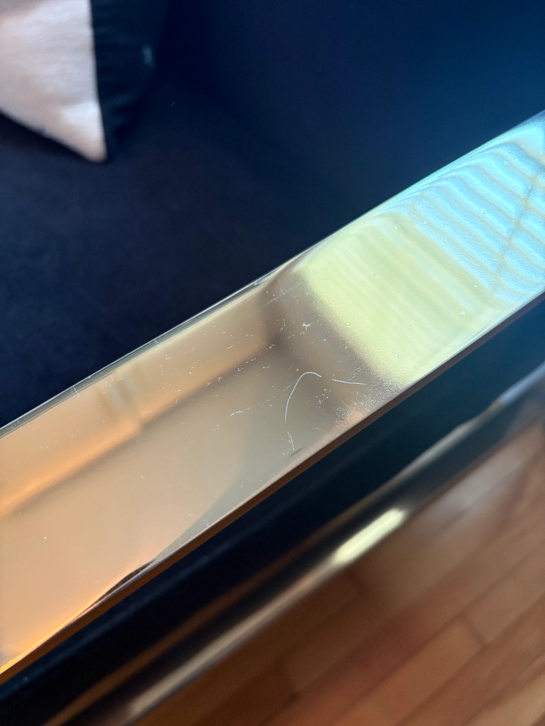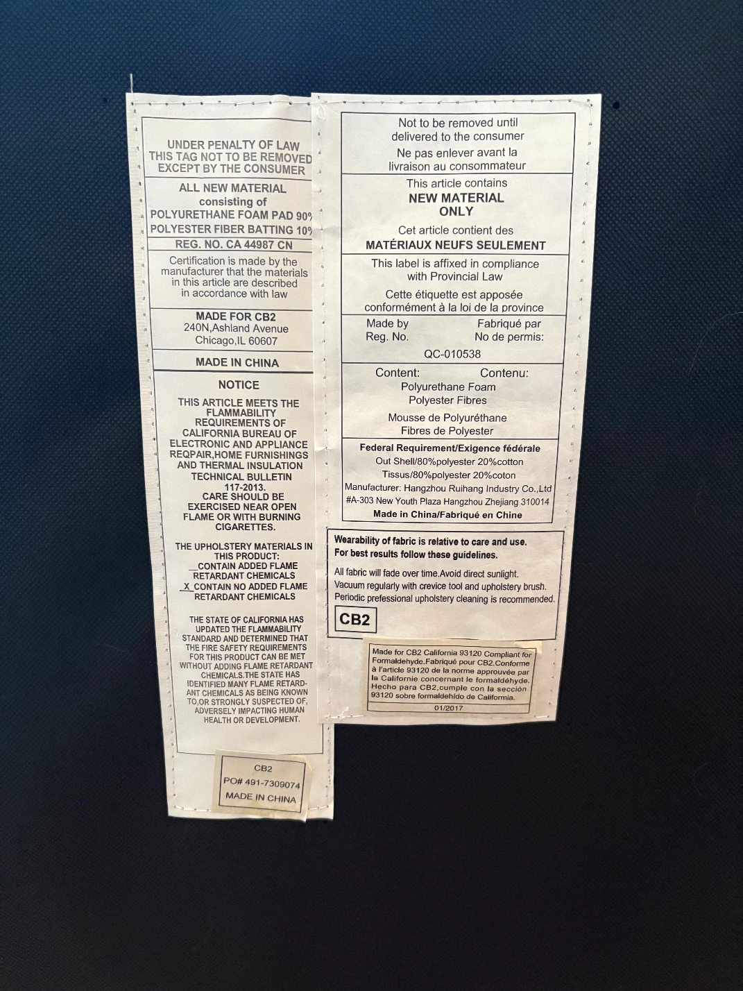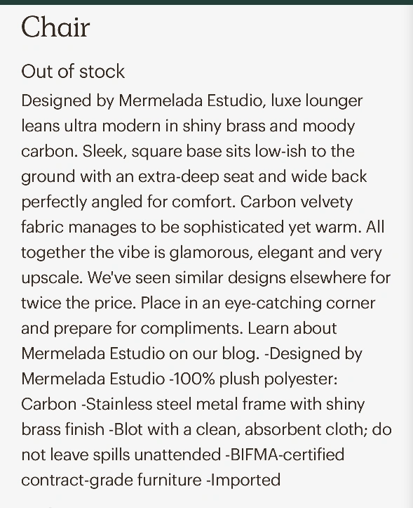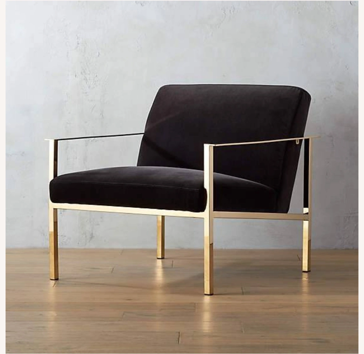 This is the Cue Carbon Chair from CB2 which retailed for $1300, but is now out of stock. This is a stylish modern armchair with a carbon black cushion and a sleek stainless steel metal frame. It's designed by Mermalada Studio and 100% plush polyester. Some minor scratches on the arm (see photo). Dimensions: 33.75" W x 31.75" D x 30" H