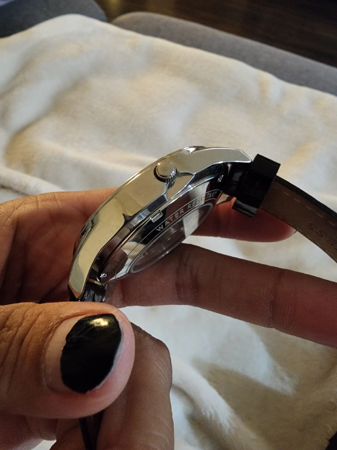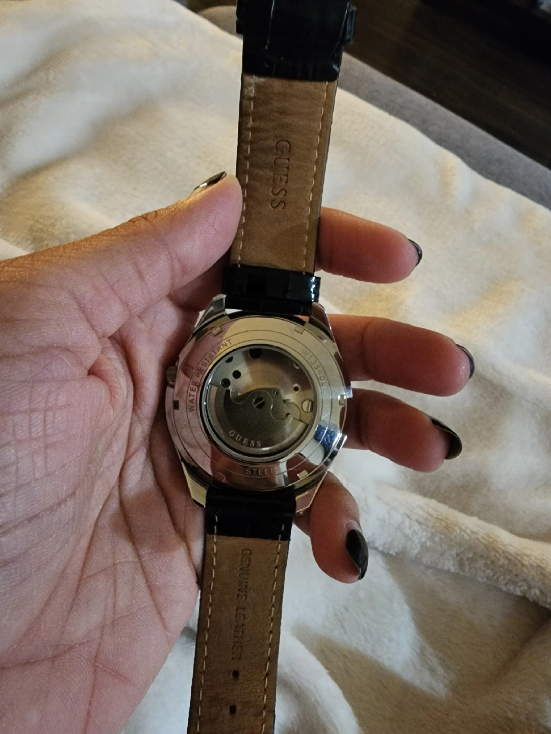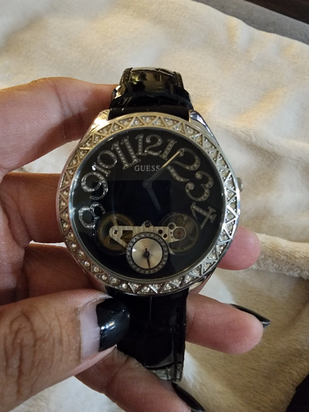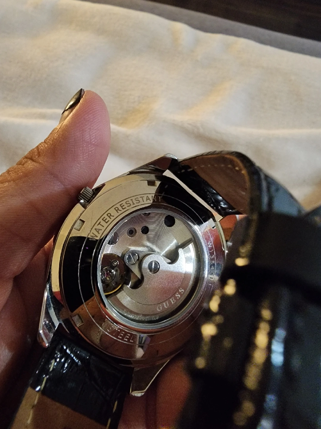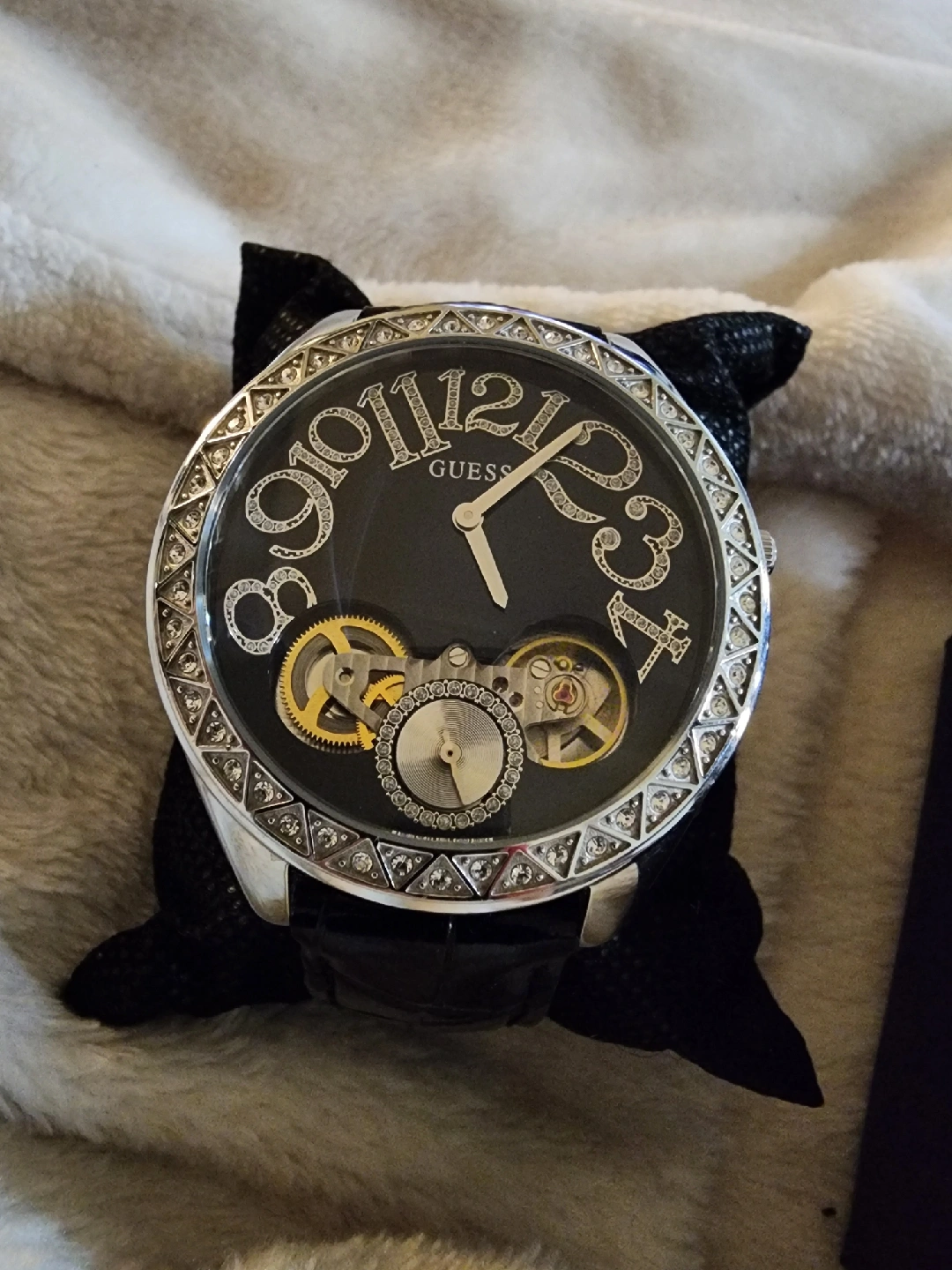 Selling a brand new Guess women's Automatic watch with a black leather band. It features a unique see-through mechanical design on the face and back, showing the inner workings of the watch. The face also has decorative stones around the edge and as numerals. The back of the watch says 'Water Resistant' and 'Stainless Steel'