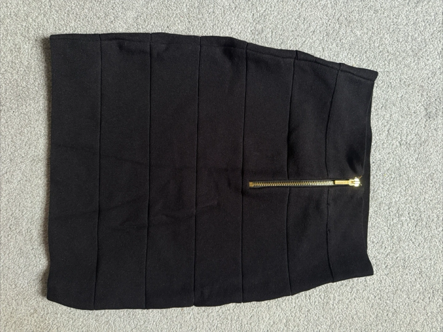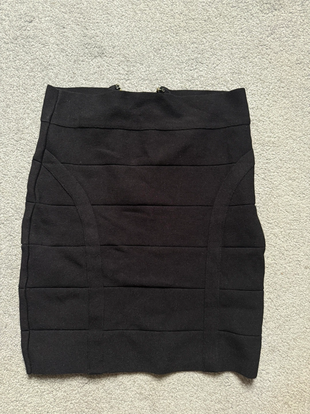 Black bandage skirt. Features a gold zipper. Has multiple horizontal and vertical lines.