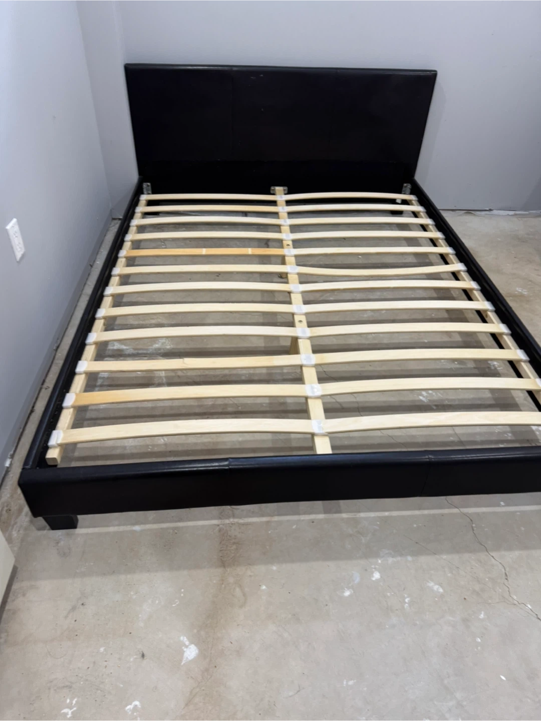 Selling a queen-size bed frame with mattress in black. It's in good condition and ready for a new home! The frame includes the wooden slats for support. Perfect for upgrading your bedroom setup